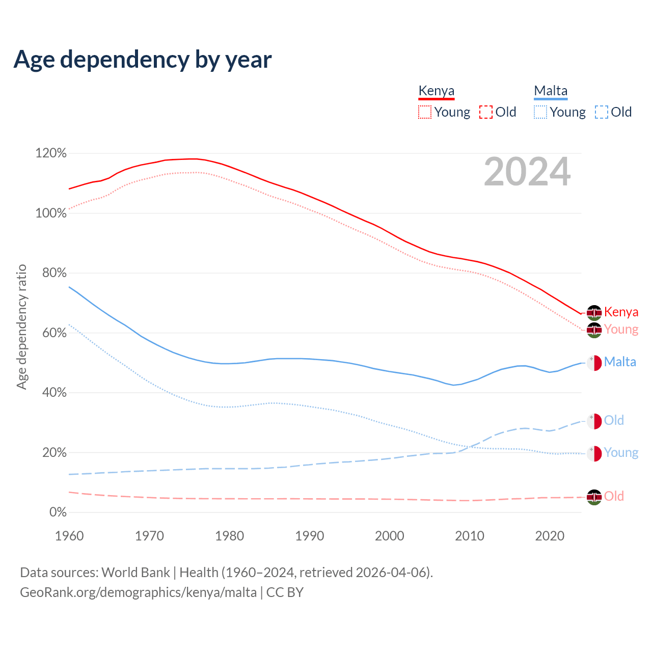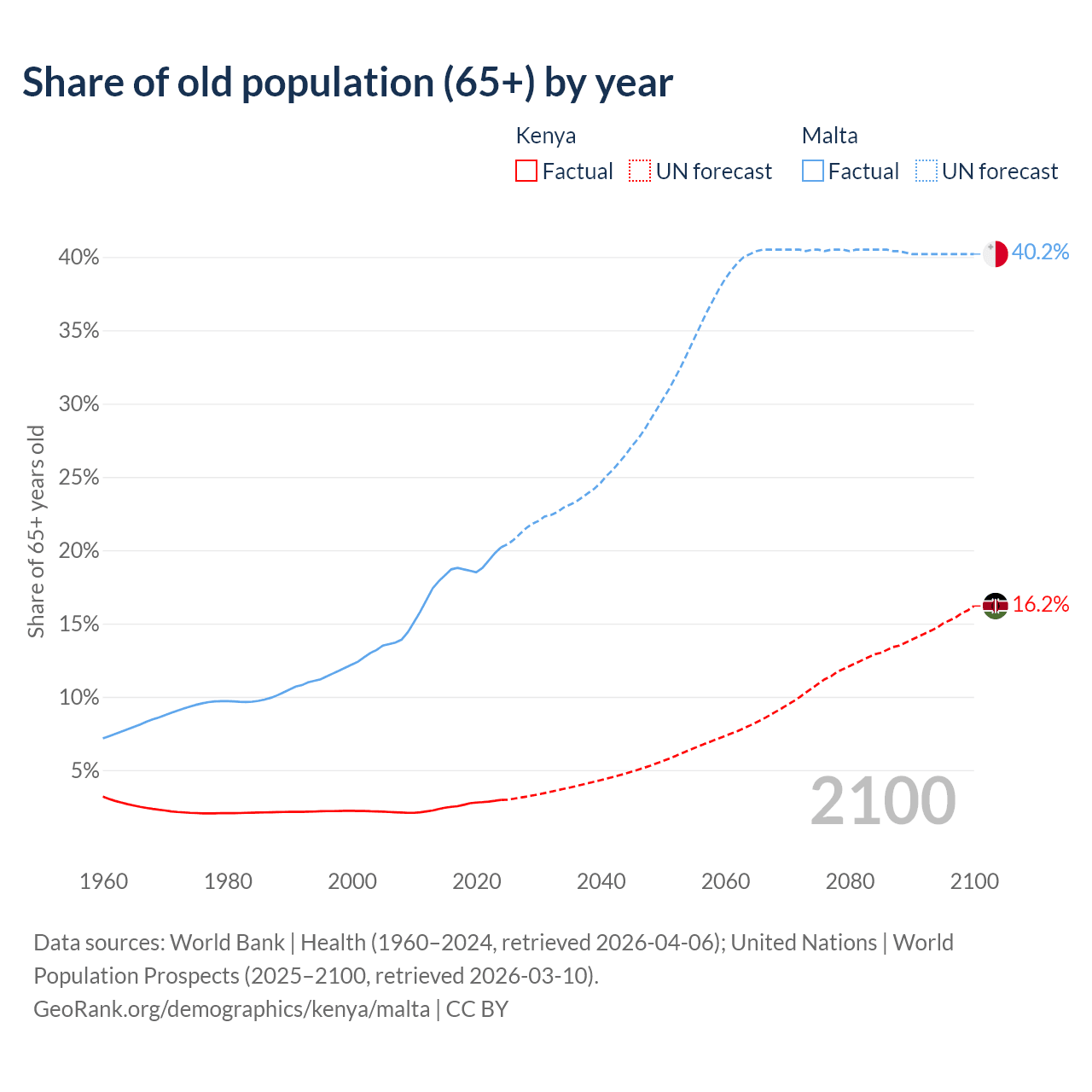 The share of older people aged 65 and over is 2.97% in Kenya and 20.2% in Malta. Life expectancy in Kenya compared to Malta .