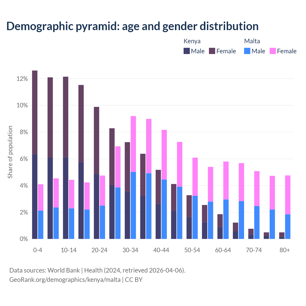 - Kenya is ranked 159/196 by median age (oldest to youngest) vs 36/196 for Malta.