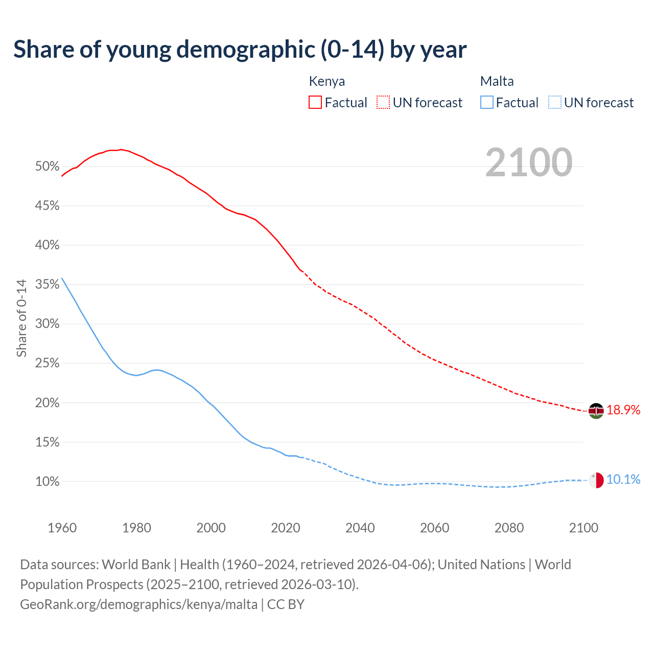 - The share of young demographic (0-15 years old) in Kenya is 36.8% vs 13% in Malta.