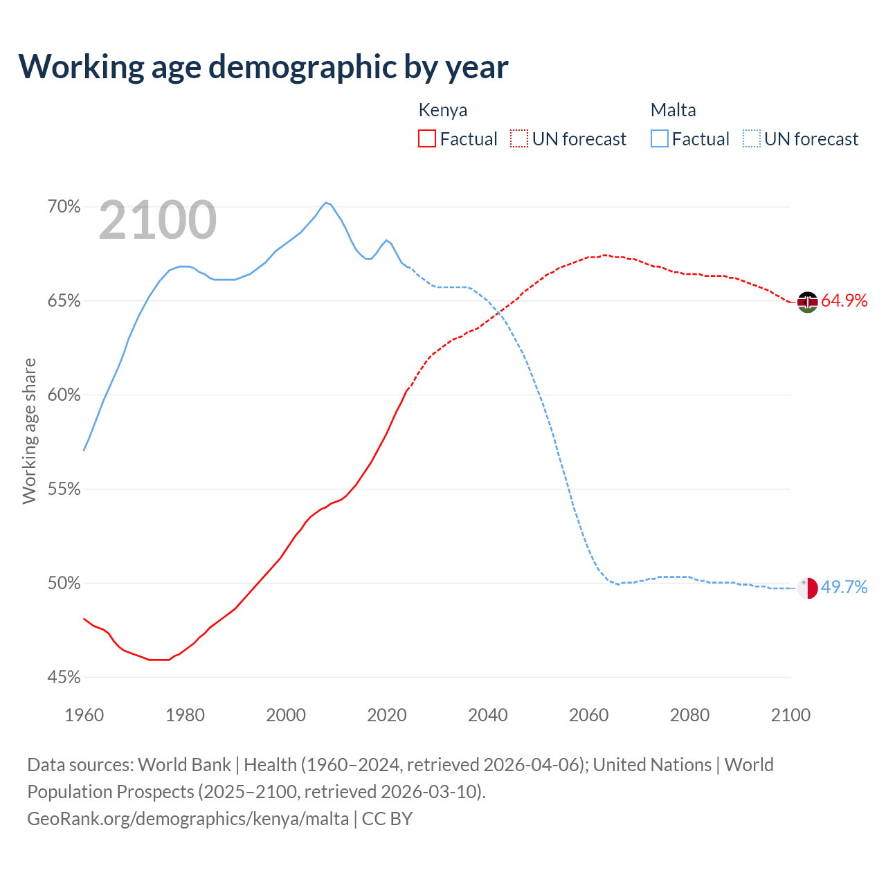 - Kenya has 35.5M working age adults (aged 15-64) vs 388K in Malta.
