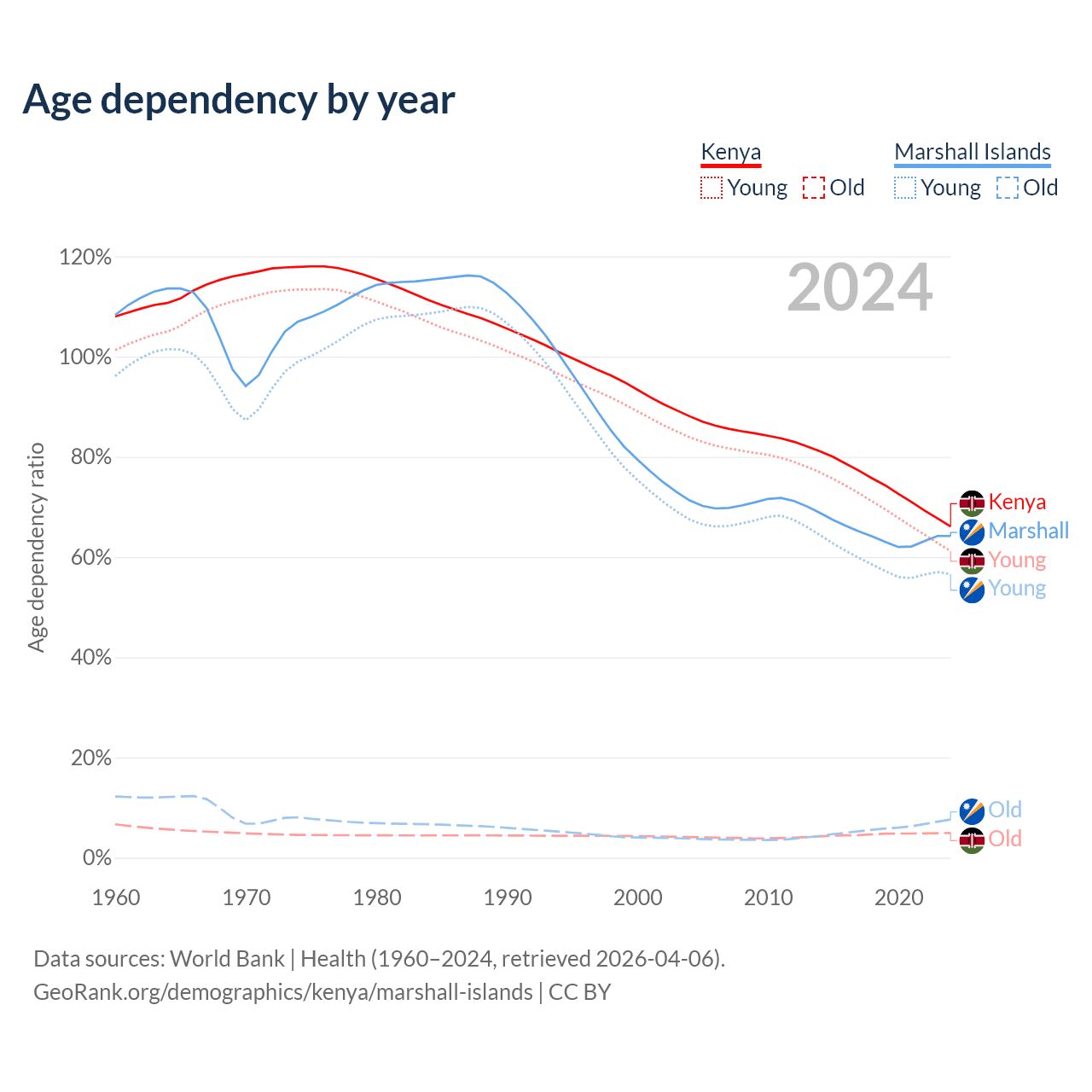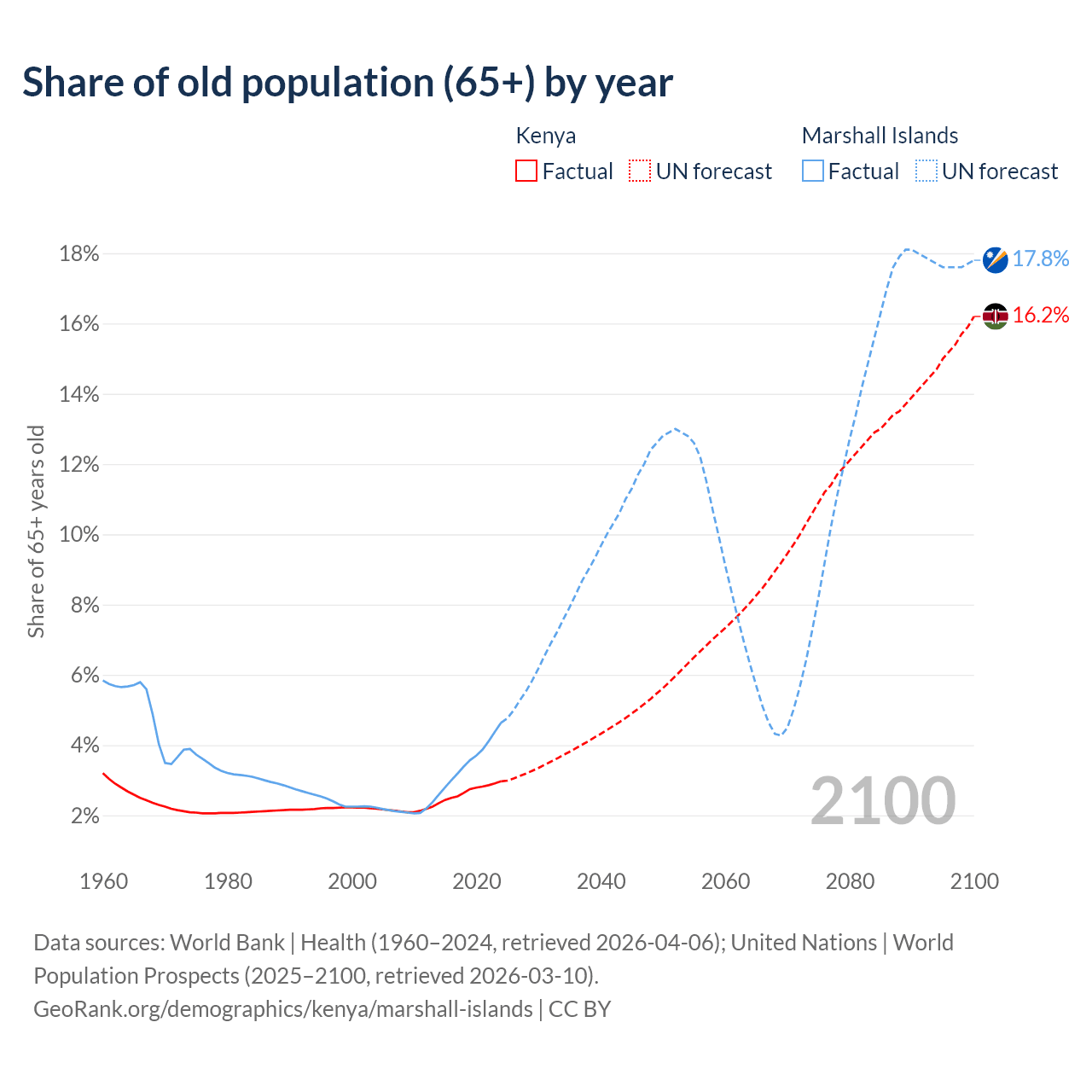 - The share of old-age demographic (65+) in Kenya is 2.97% vs 4.64% in the Marshall Islands.