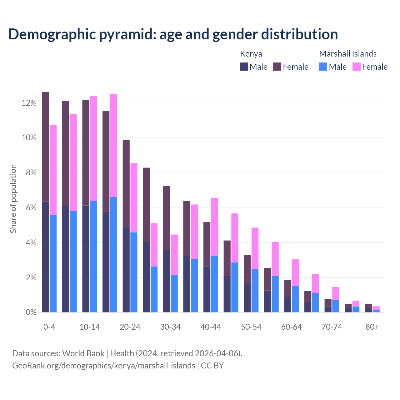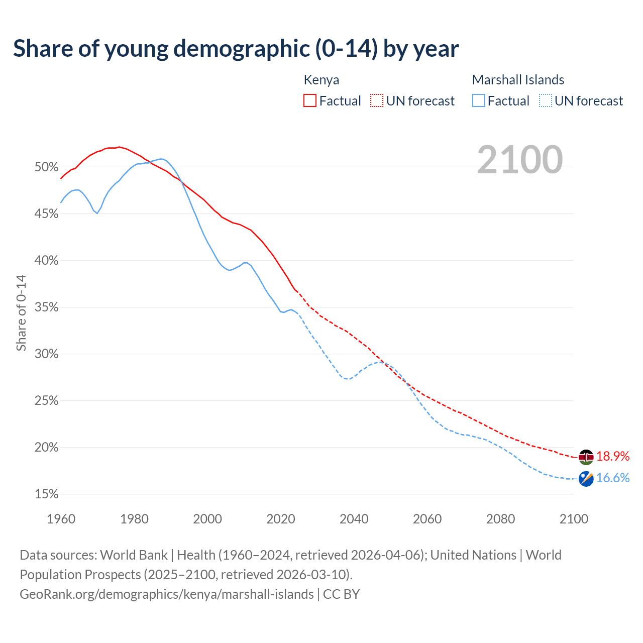 - The share of young demographic (0-15 years old) in Kenya is 36.8% vs 34.5% in the Marshall Islands.