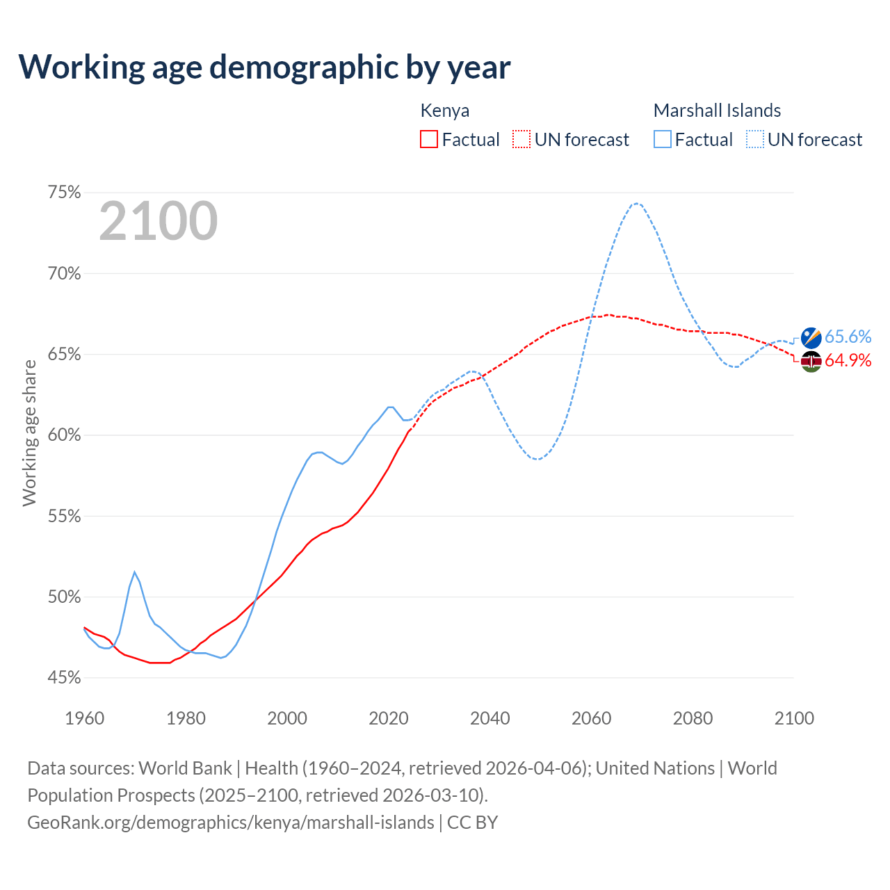 - Kenya has 35.5M working age adults (aged 15-64) vs 21.3K in the Marshall Islands.