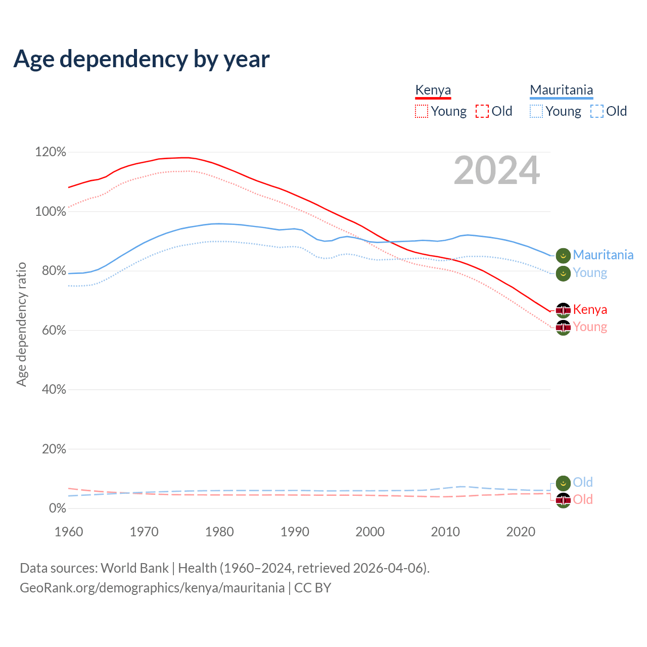 The share of older people aged 65 and over is 2.97% in Kenya and 3.23% in Mauritania. Life expectancy in Kenya compared to Mauritania .
