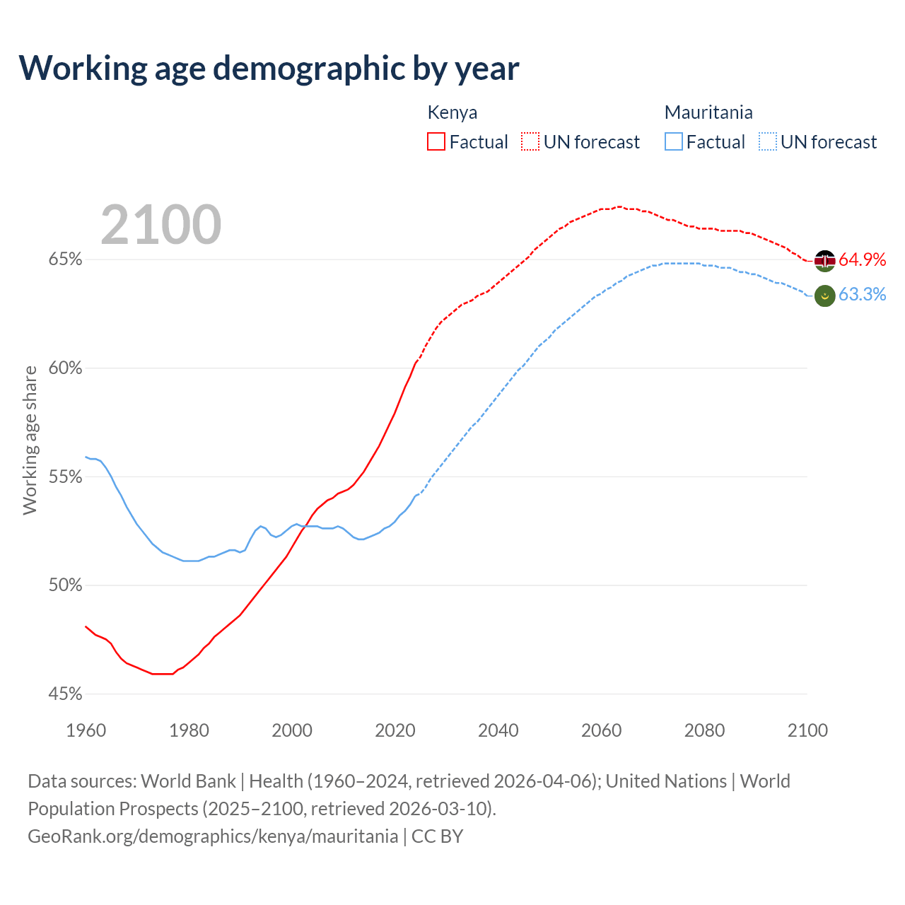 - Kenya has 35.5M working age adults (aged 15-64) vs 2.98M in Mauritania.
