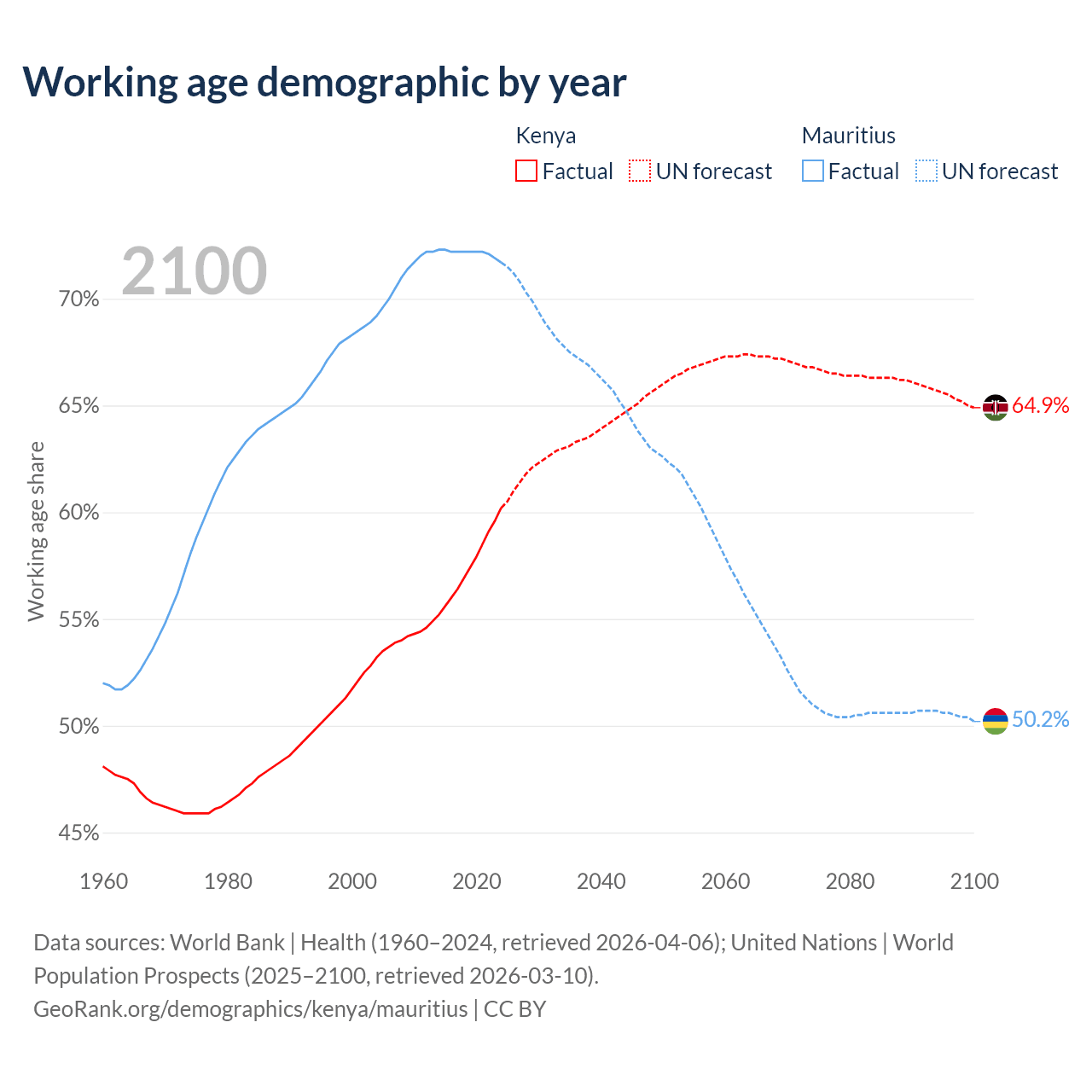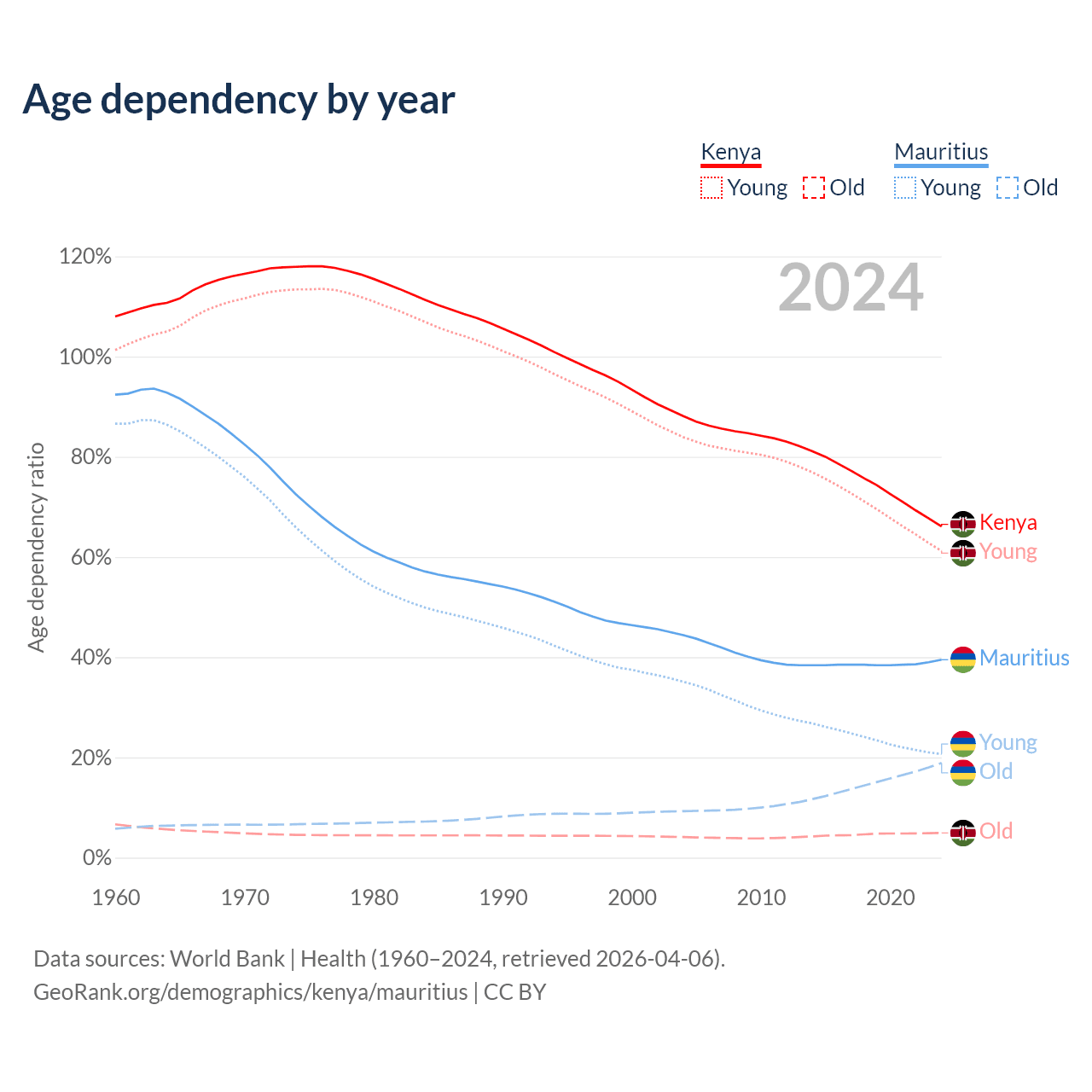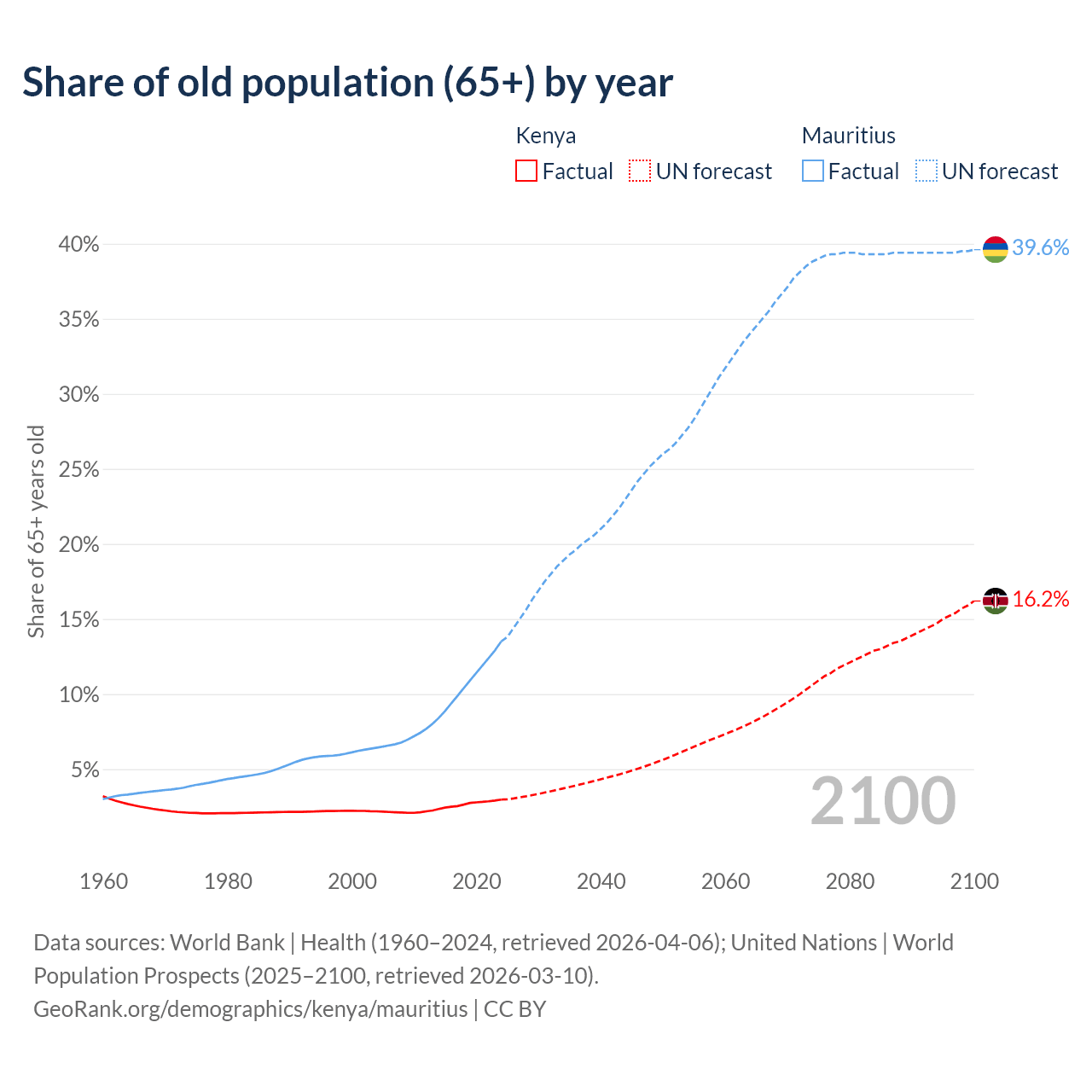 The share of older people aged 65 and over is 2.97% in Kenya and 13.5% in Mauritius. Life expectancy in Kenya compared to Mauritius .