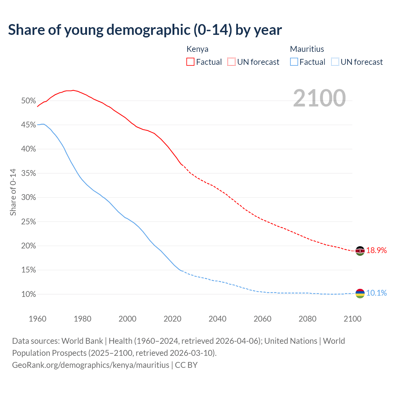 - The share of young demographic (0-15 years old) in Kenya is 36.8% vs 14.8% in Mauritius.