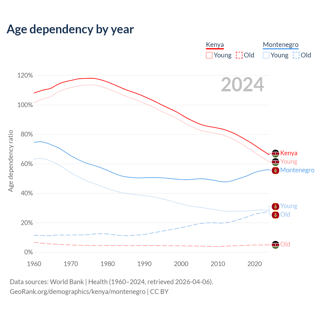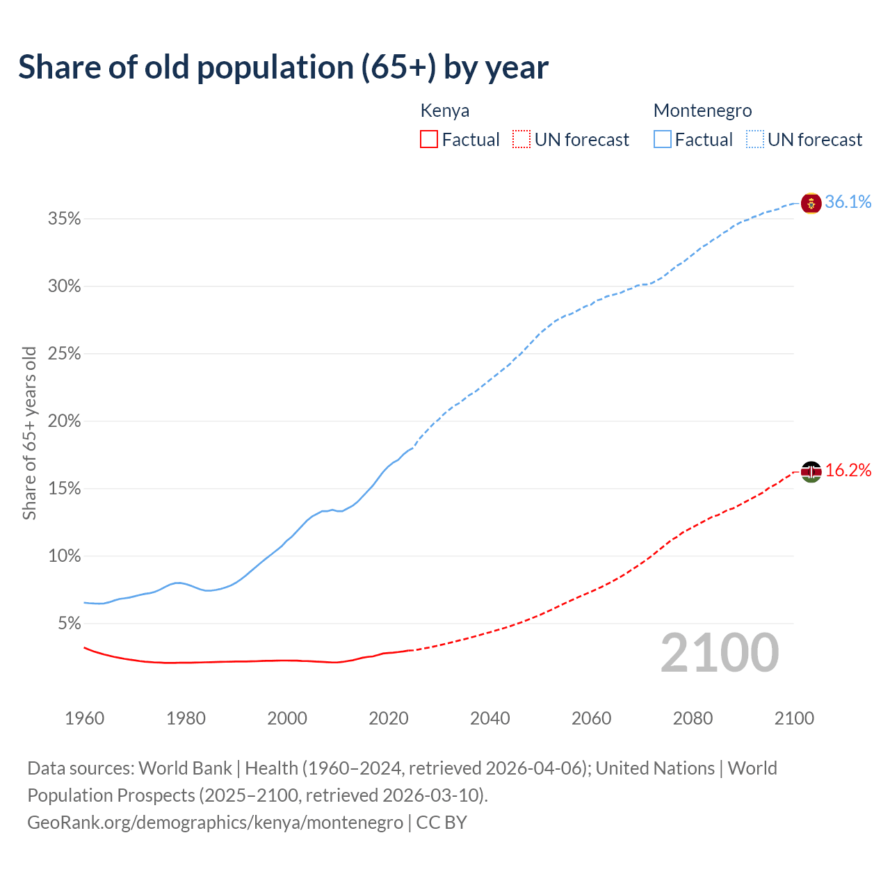 The share of older people aged 65 and over is 2.97% in Kenya and 17.8% in Montenegro. Life expectancy in Kenya compared to Montenegro .