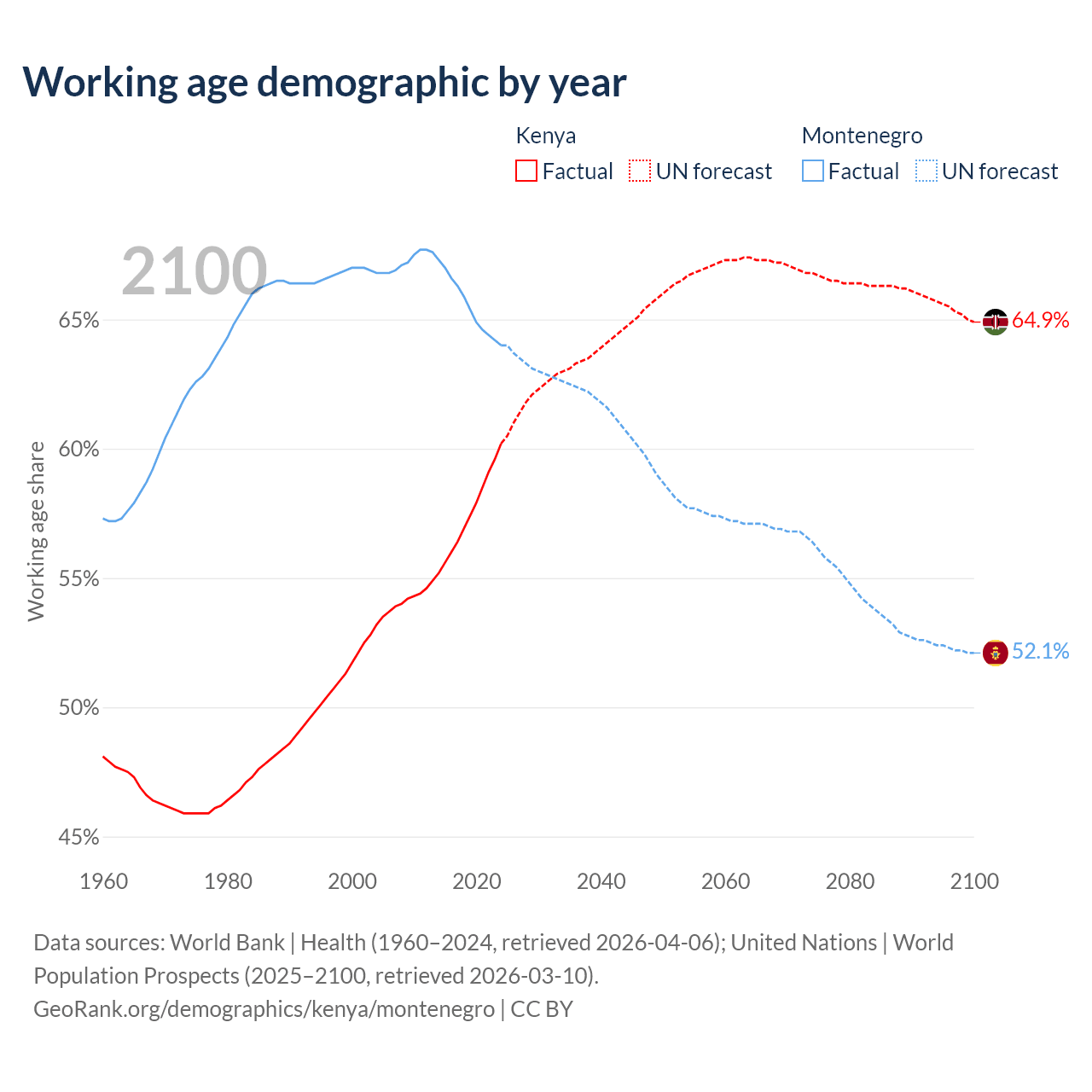 - Kenya has 35.5M working age adults (aged 15-64) vs 392K in Montenegro.