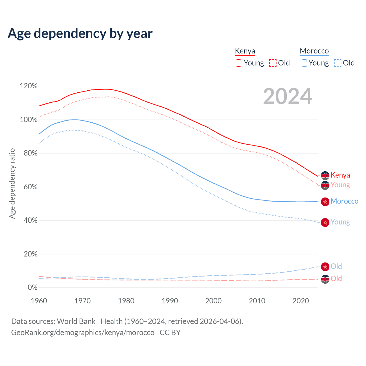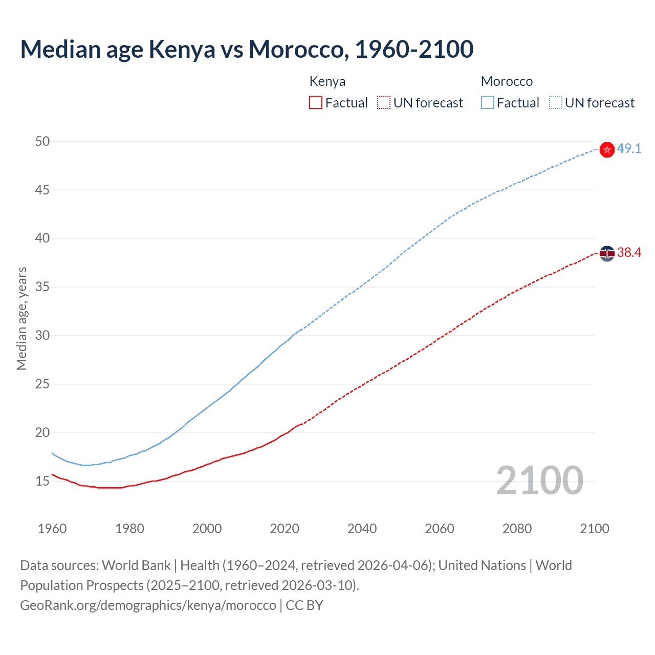 - Kenya is ranked 159/196 by median age (oldest to youngest) vs 100/196 for Morocco.