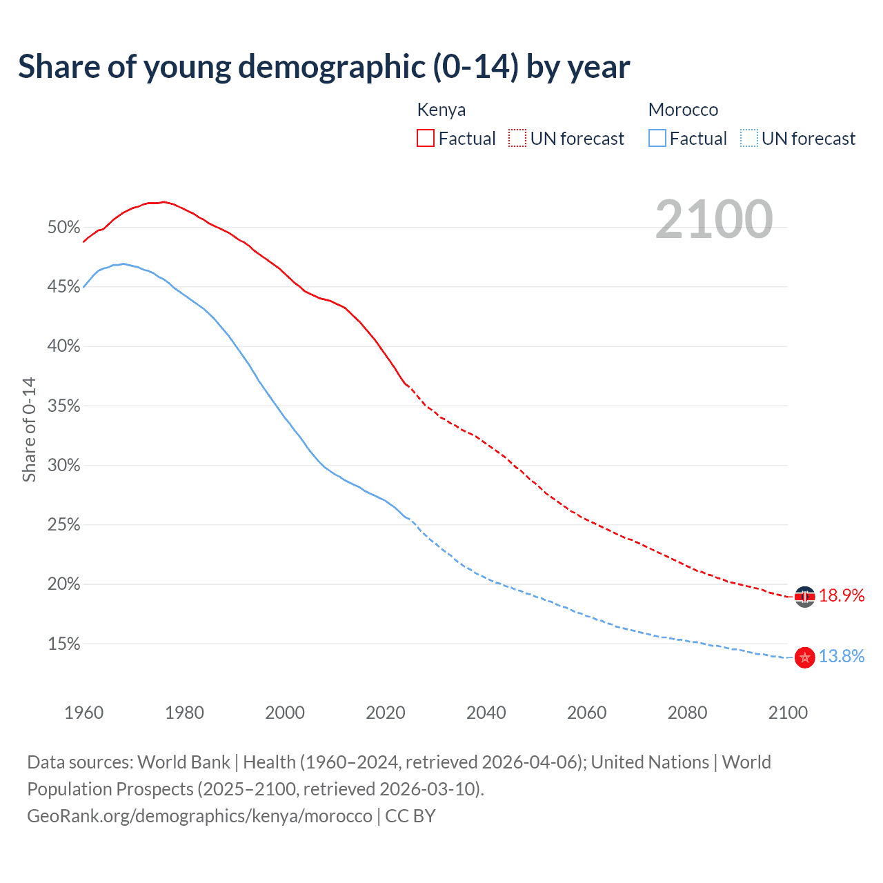 - The share of young demographic (0-15 years old) in Kenya is 36.8% vs 25.6% in Morocco.