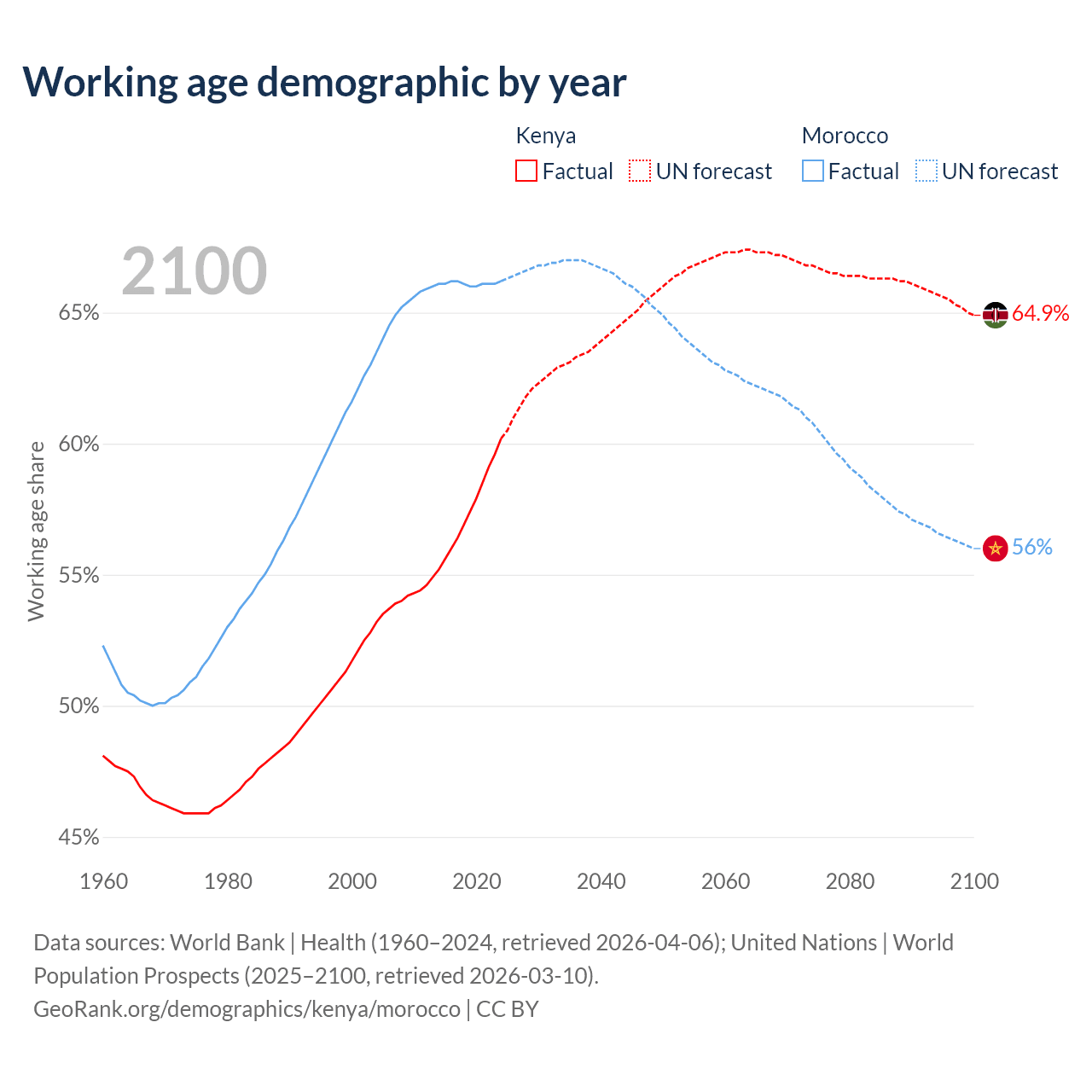 - Kenya has 35.5M working age adults (aged 15-64) vs 25.7M in Morocco.