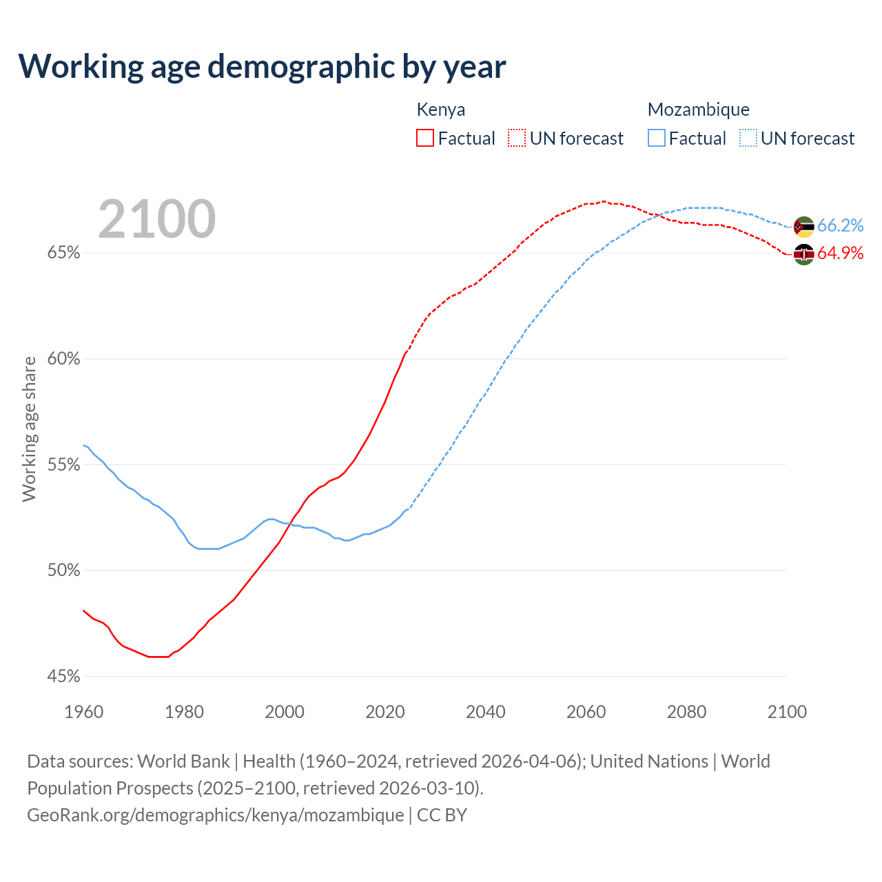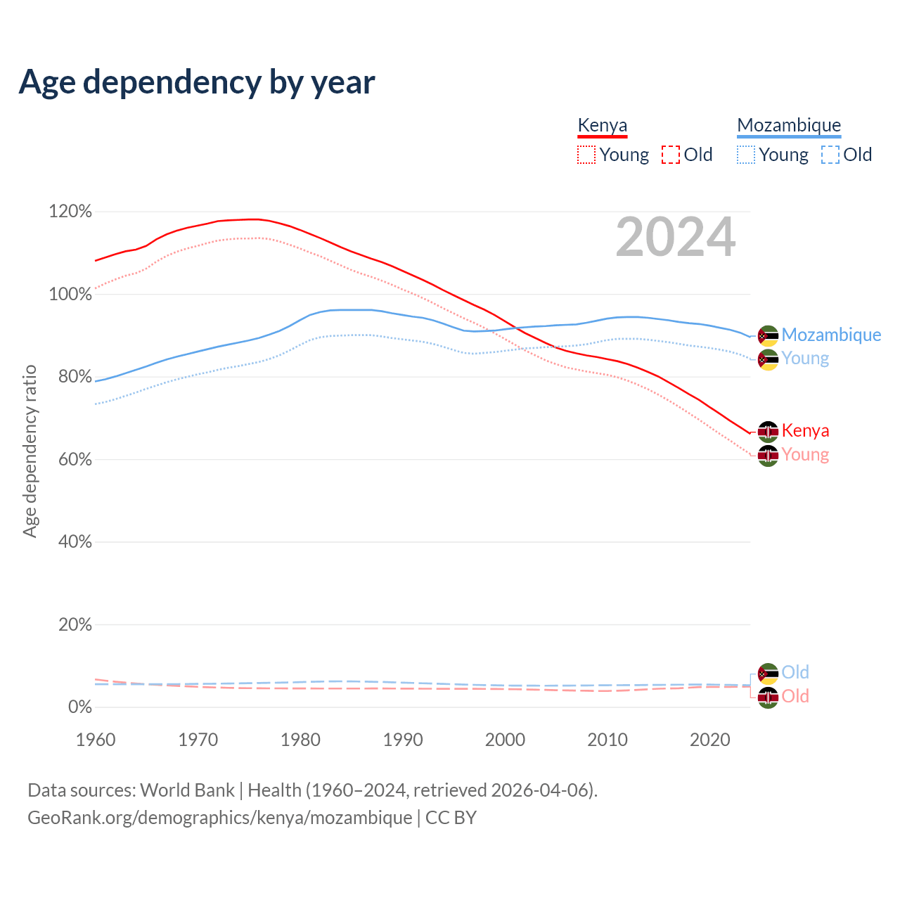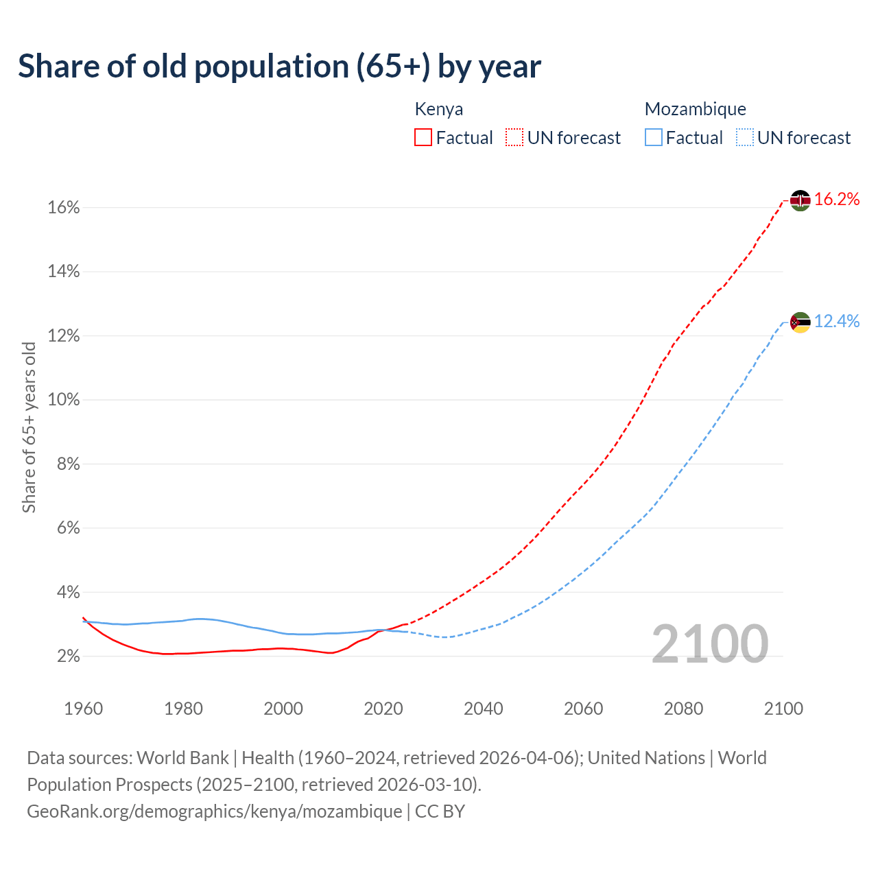 The share of older people aged 65 and over is 2.97% in Kenya and 2.75% in Mozambique. Life expectancy in Kenya compared to Mozambique .