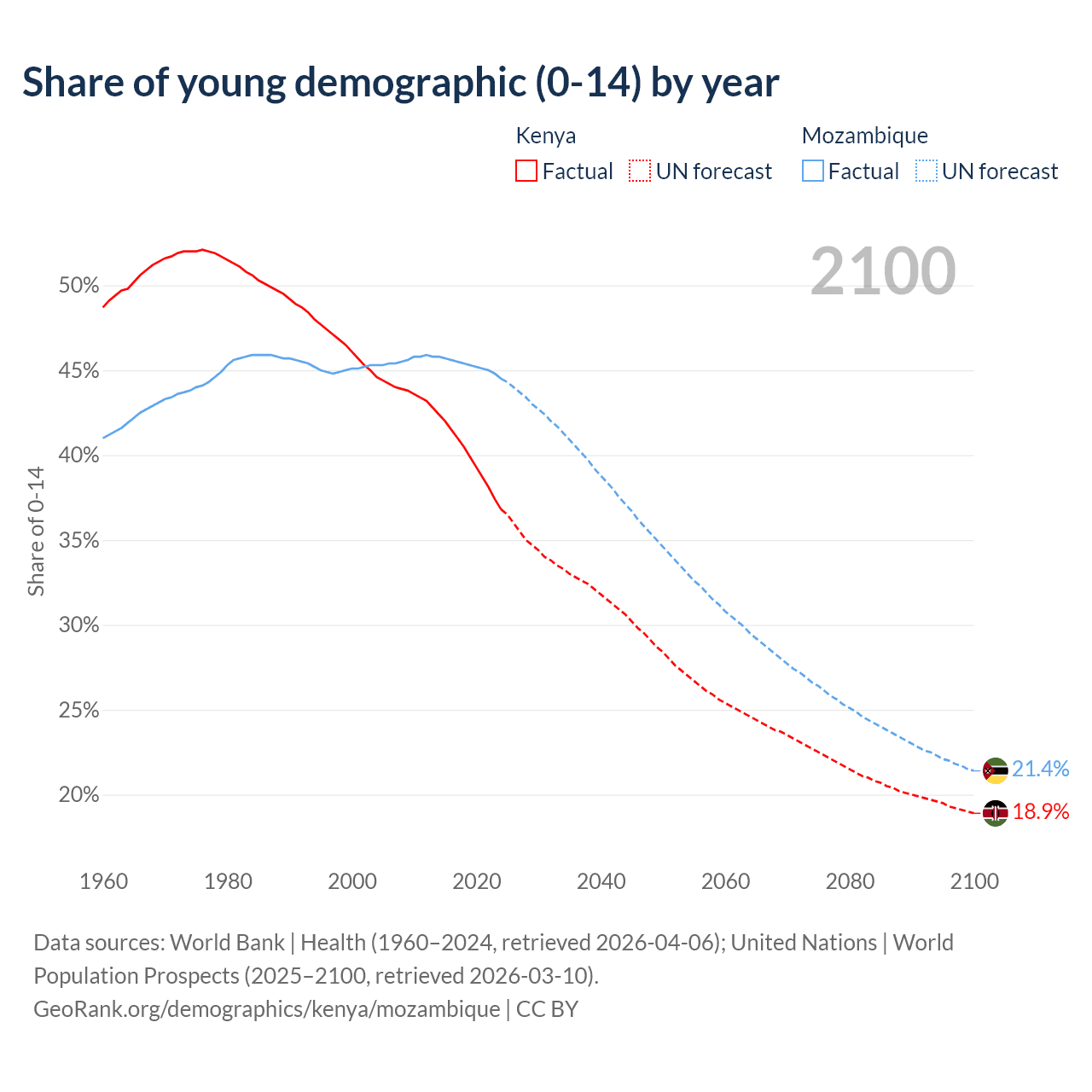 Median age Kenya vs Mozambique, 1960-2100