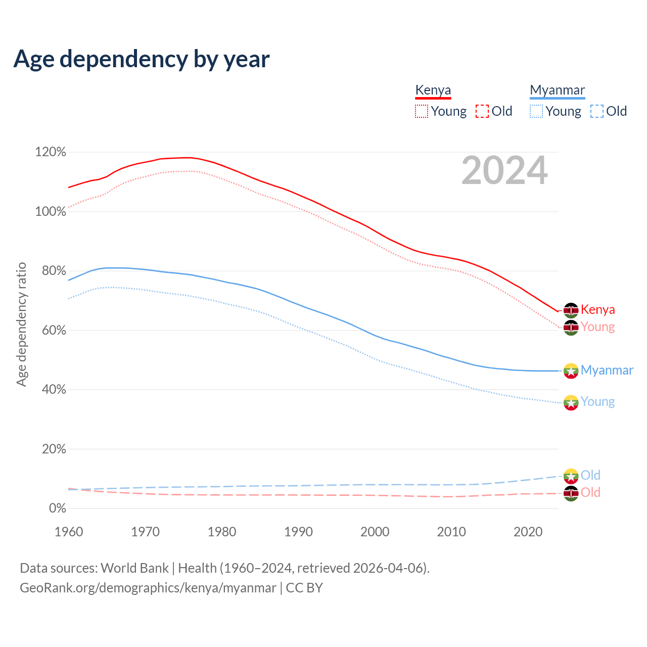 - Kenya is ranked 159/196 by median age (oldest to youngest) vs 96/196 for Myanmar.