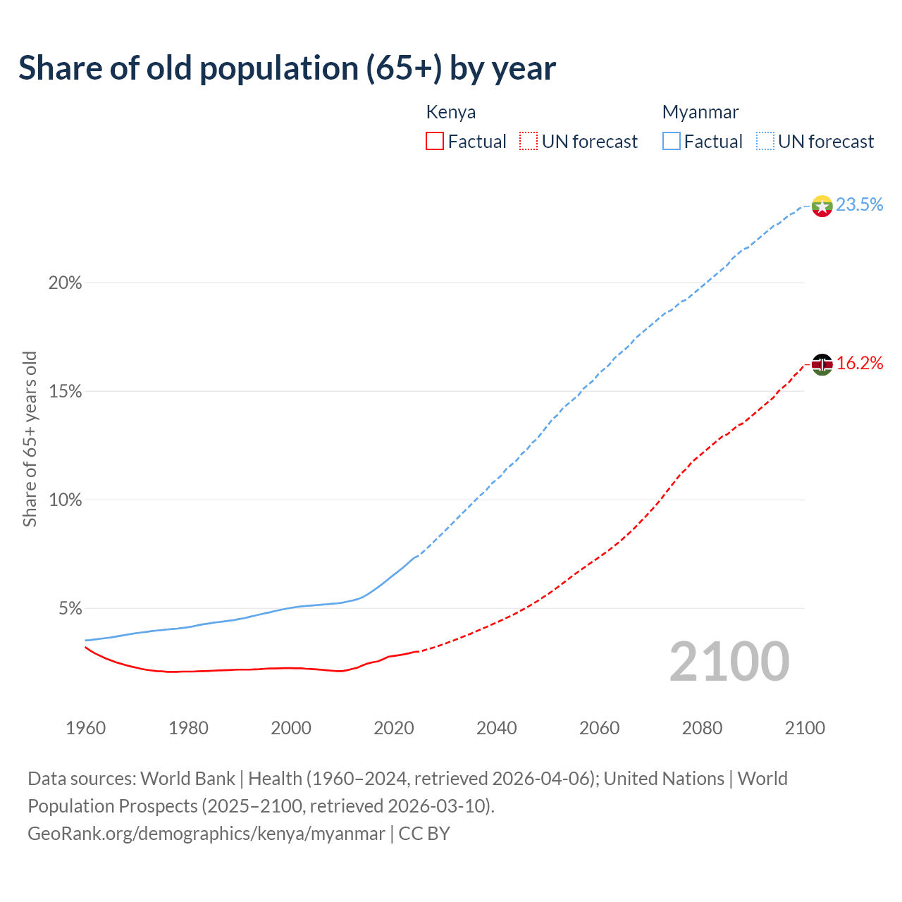 The share of older people aged 65 and over is 2.97% in Kenya and 7.3% in Myanmar. Life expectancy in Kenya compared to Myanmar .
