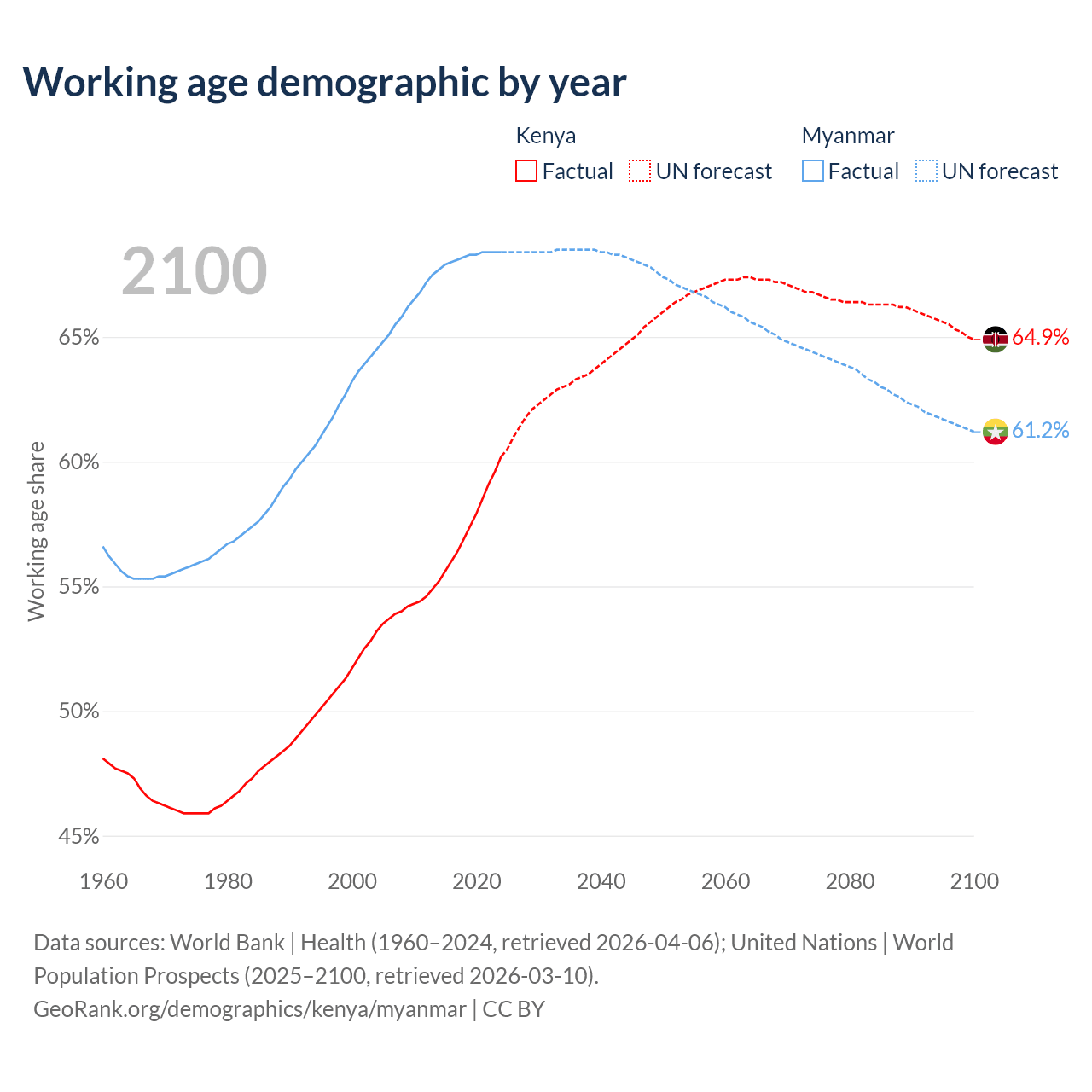 - Kenya has 35.5M working age adults (aged 15-64) vs 37.8M in Myanmar.