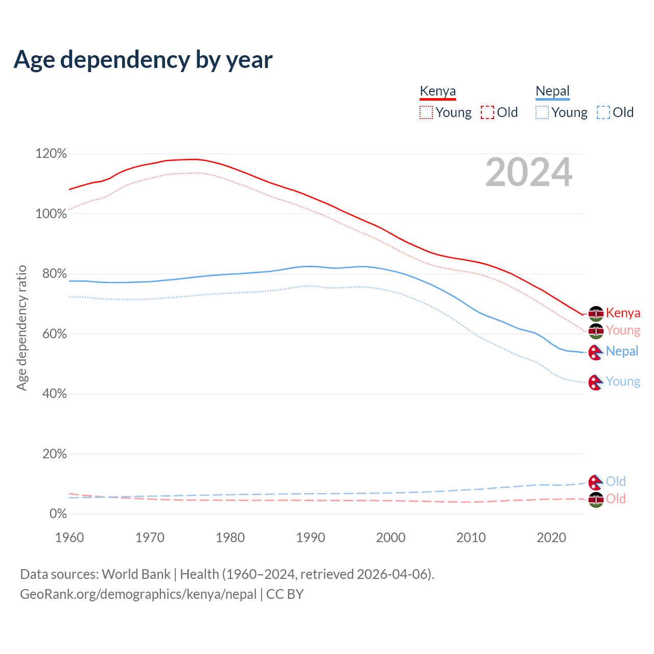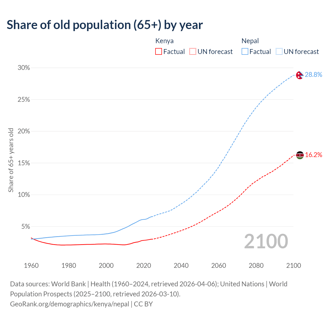 The share of older people aged 65 and over is 2.97% in Kenya and 6.5% in Nepal. Life expectancy in Kenya compared to Nepal .