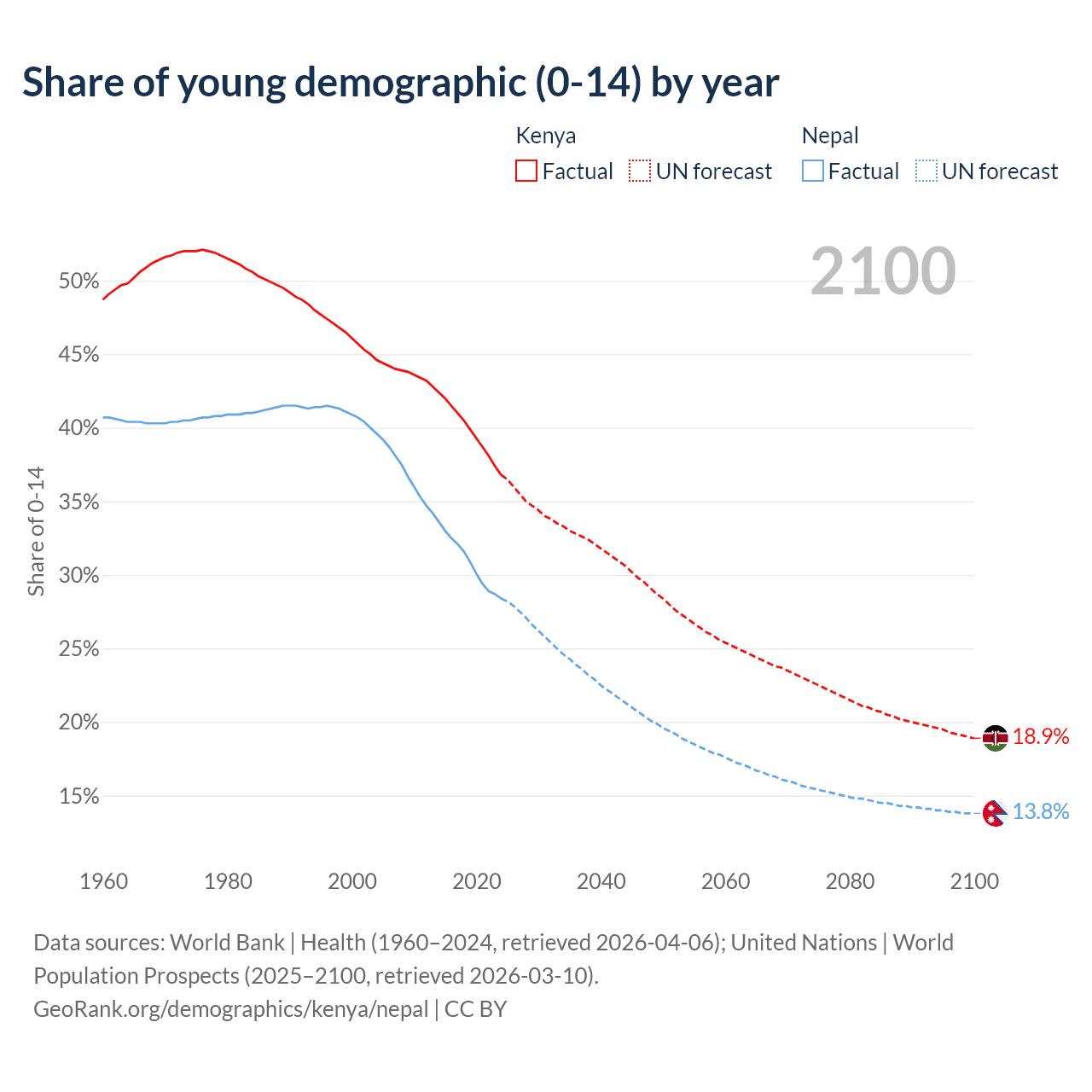 - The share of young demographic (0-15 years old) in Kenya is 36.8% vs 28.4% in Nepal.