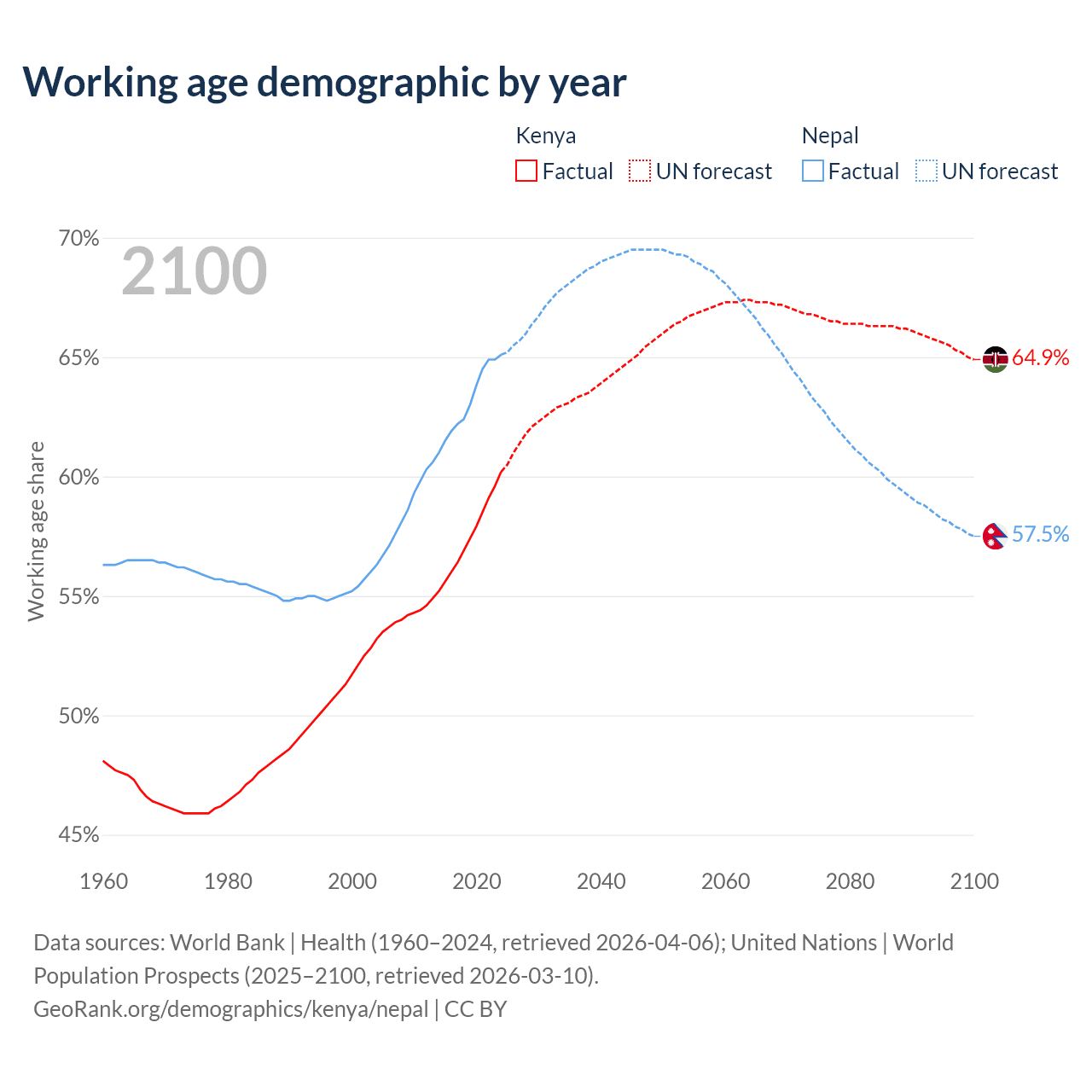 - Kenya has 35.5M working age adults (aged 15-64) vs 19.3M in Nepal.