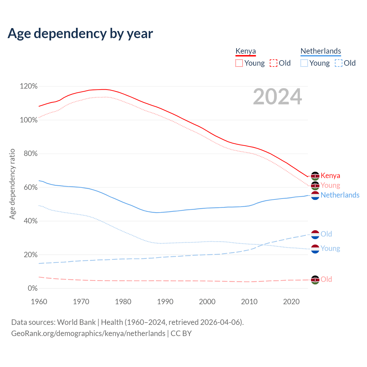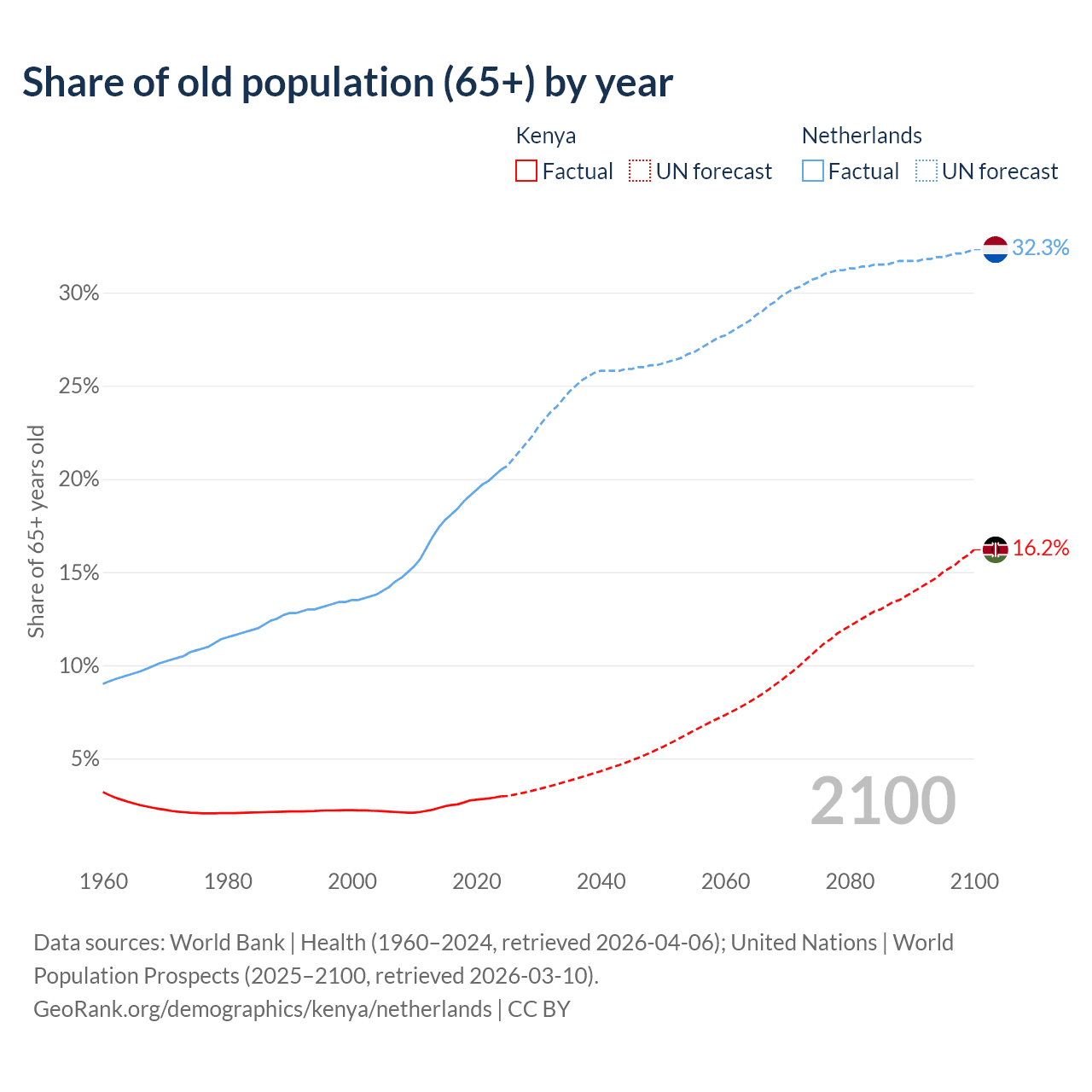 The share of older people aged 65 and over is 2.97% in Kenya and 20.5% in the Netherlands. Life expectancy in Kenya compared to the Netherlands .