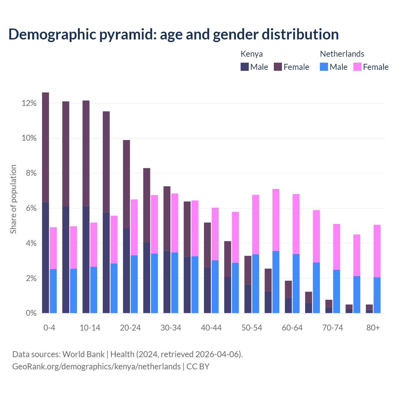 - Kenya is ranked 159/196 by median age (oldest to youngest) vs 33/196 for the Netherlands.