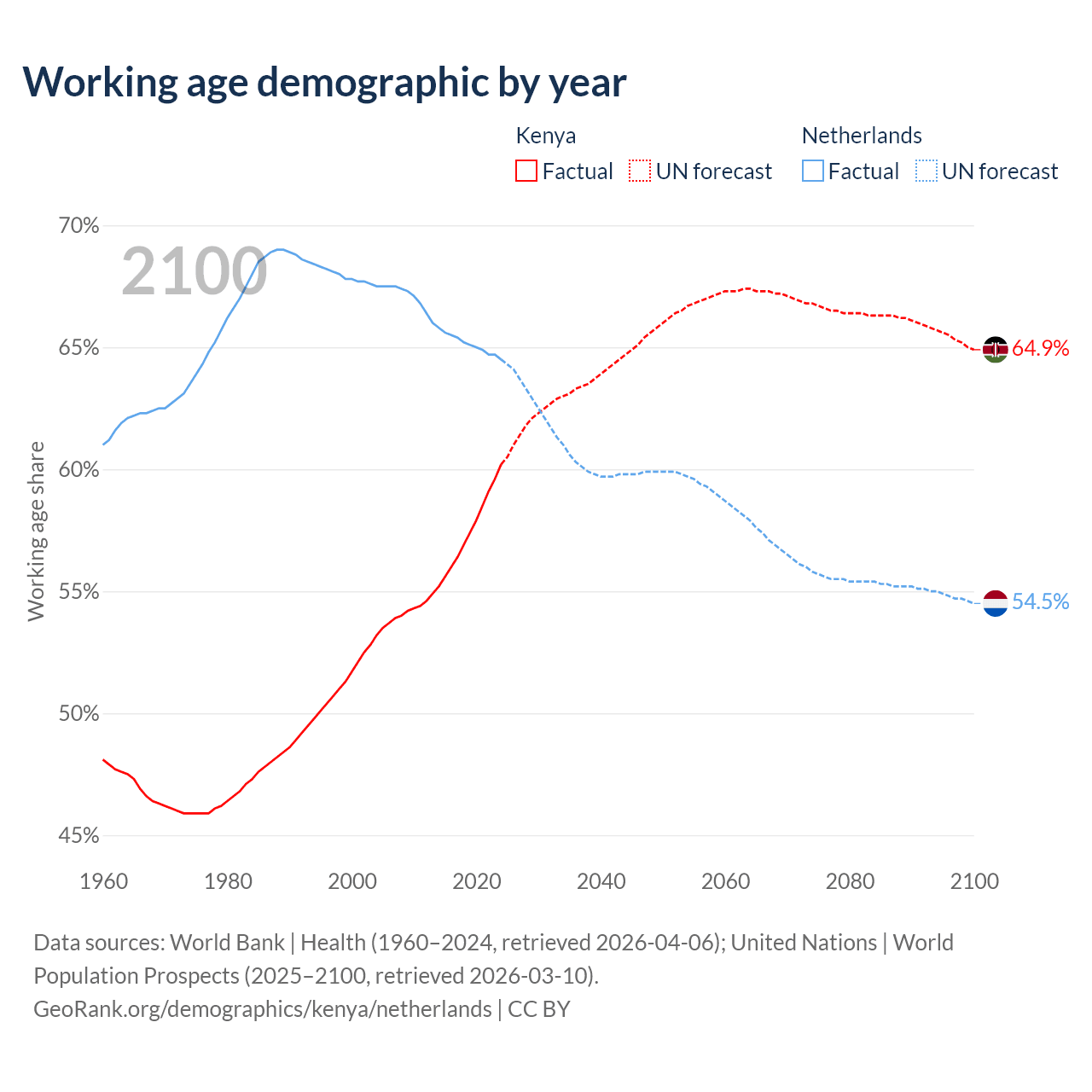 - Kenya has 35.5M working age adults (aged 15-64) vs 11.8M in the Netherlands.