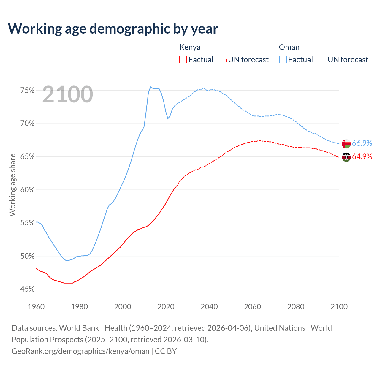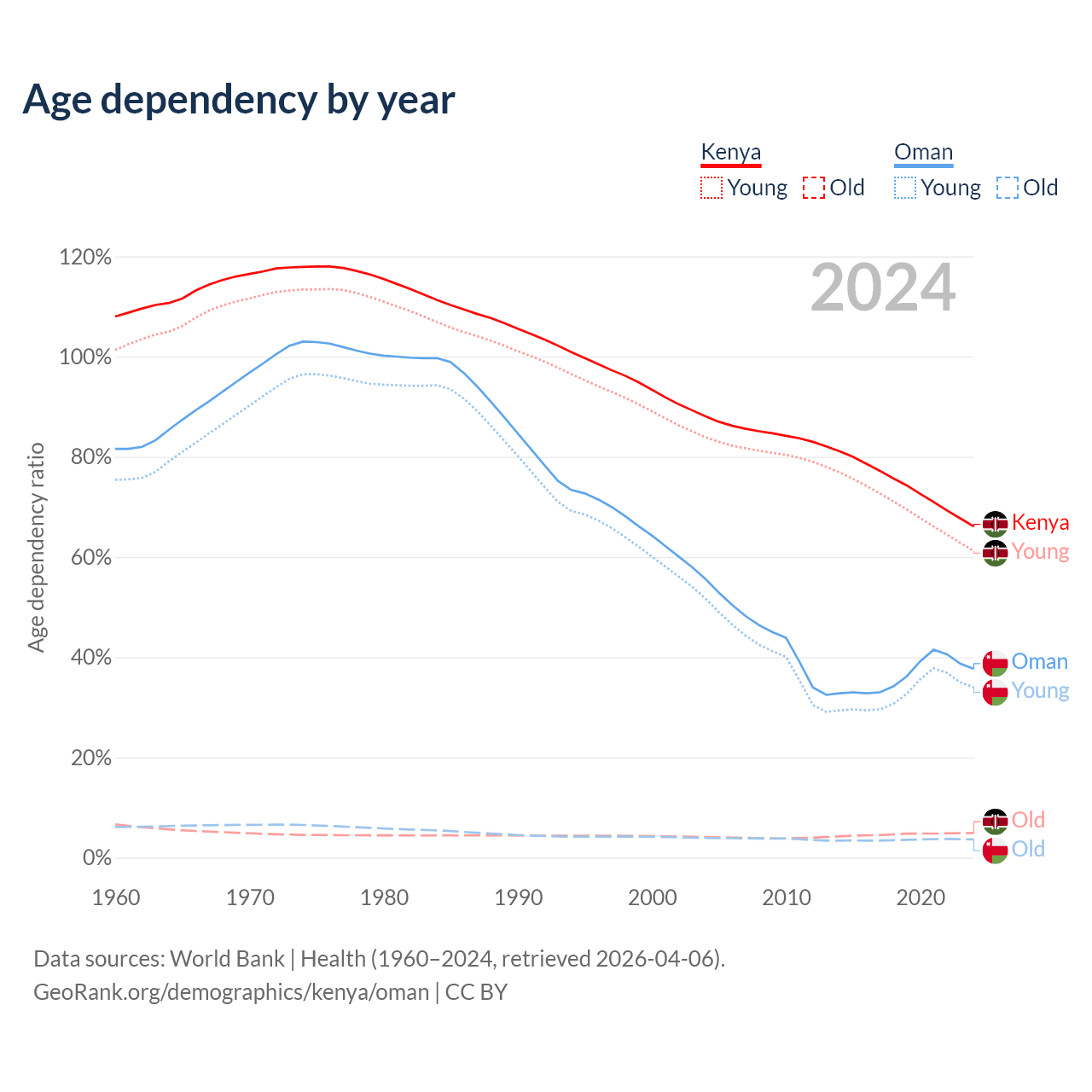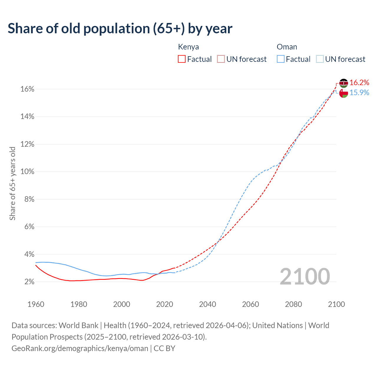 The share of older people aged 65 and over is 2.97% in Kenya and 2.64% in Oman. Life expectancy in Kenya compared to Oman .