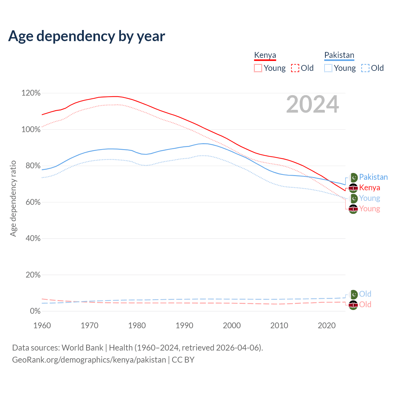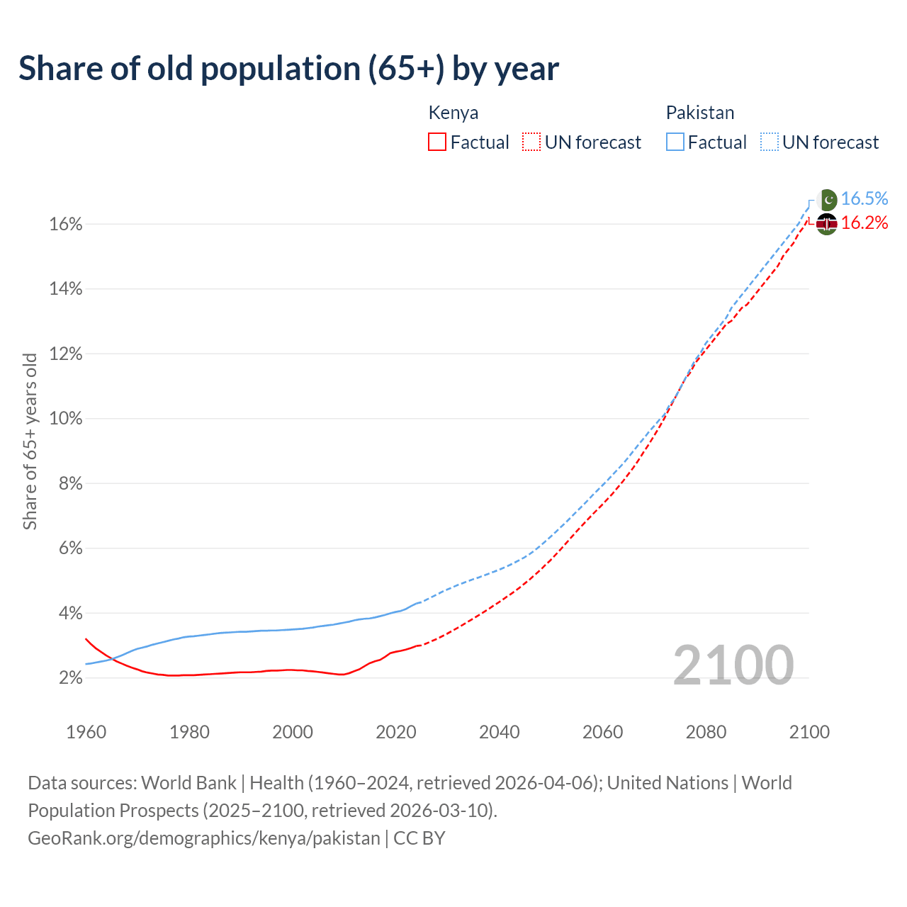The share of older people aged 65 and over is 2.97% in Kenya and 4.28% in Pakistan. Life expectancy in Kenya compared to Pakistan .
