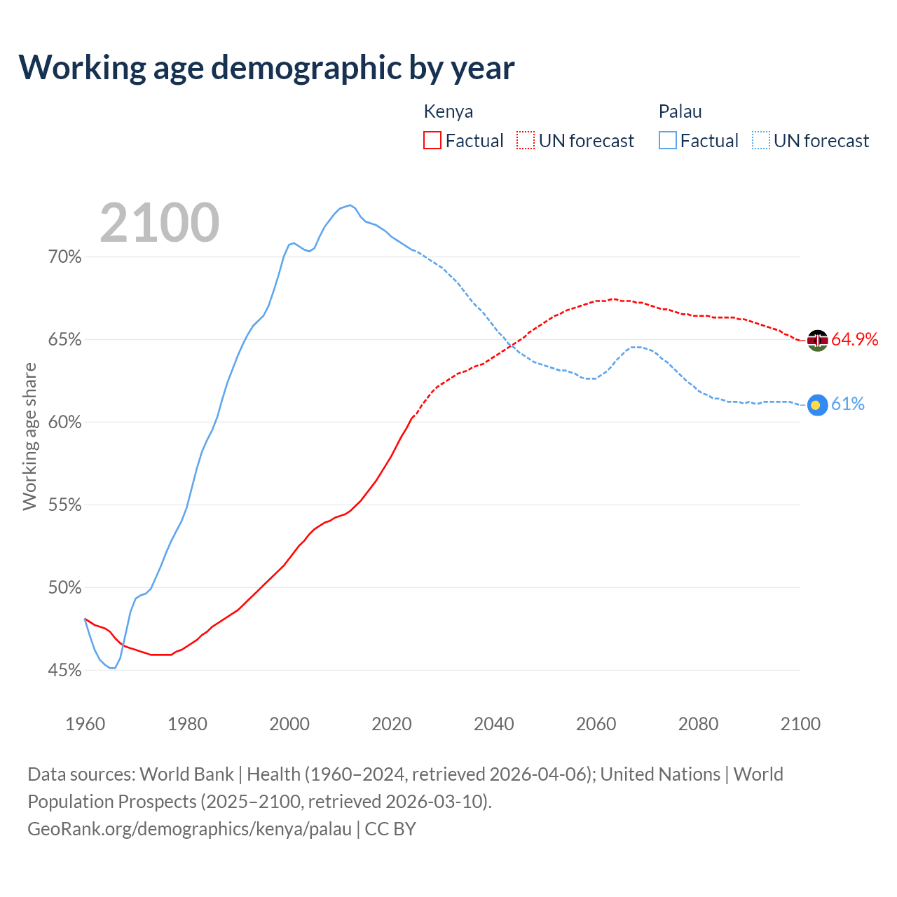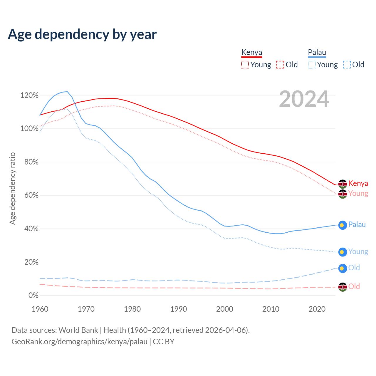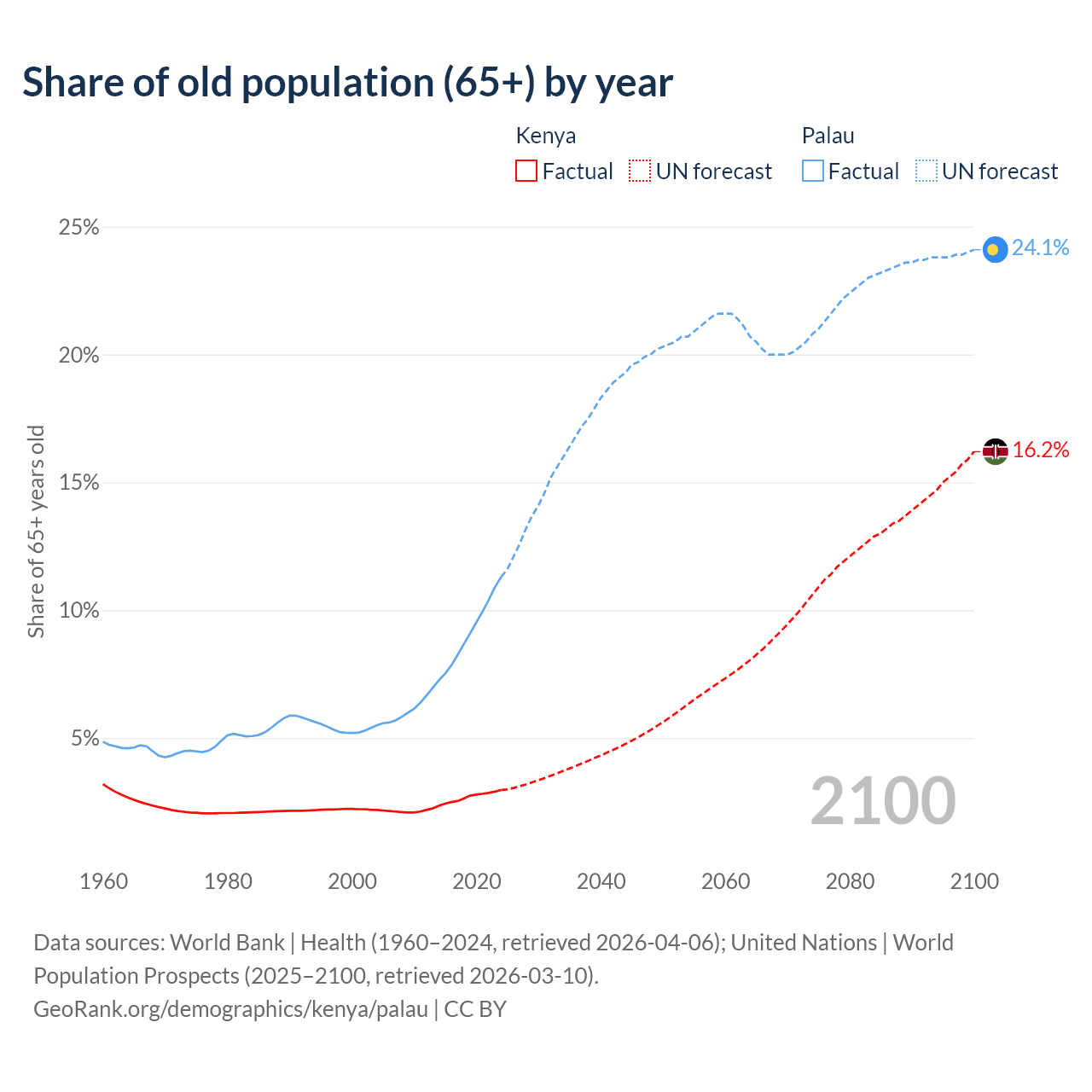 The share of older people aged 65 and over is 2.97% in Kenya and 11.3% in Palau. Life expectancy in Kenya compared to Palau .