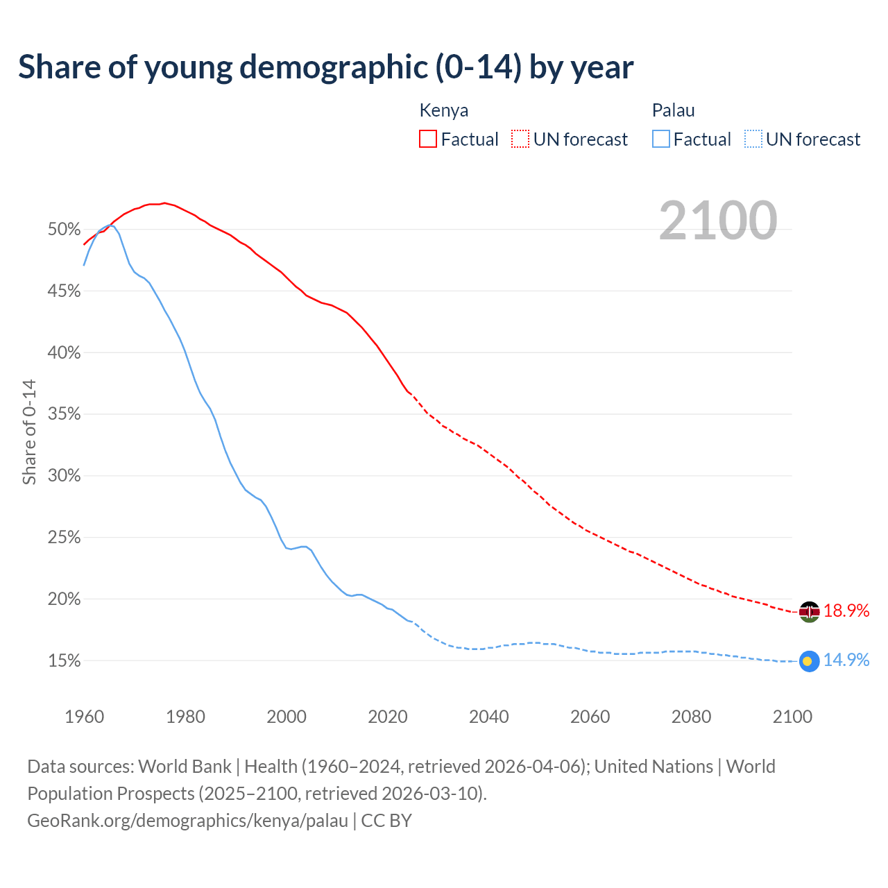- The share of young demographic (0-15 years old) in Kenya is 36.8% vs 18.2% in Palau.