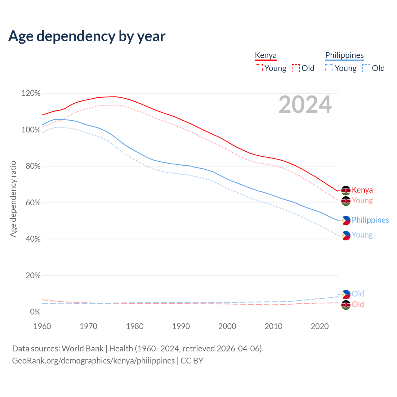 Data sources: World Bank | Health (1960–2024, retrieved 2026-04-06); U.S. Census Bureau (1960–2024, retrieved 2026-02-08).