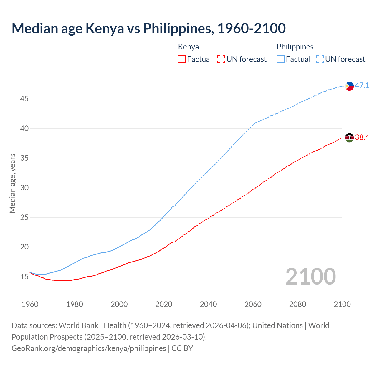 Median age Kenya vs Philippines, 1960-2100