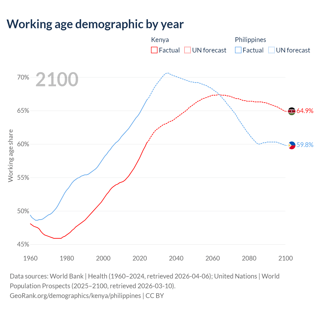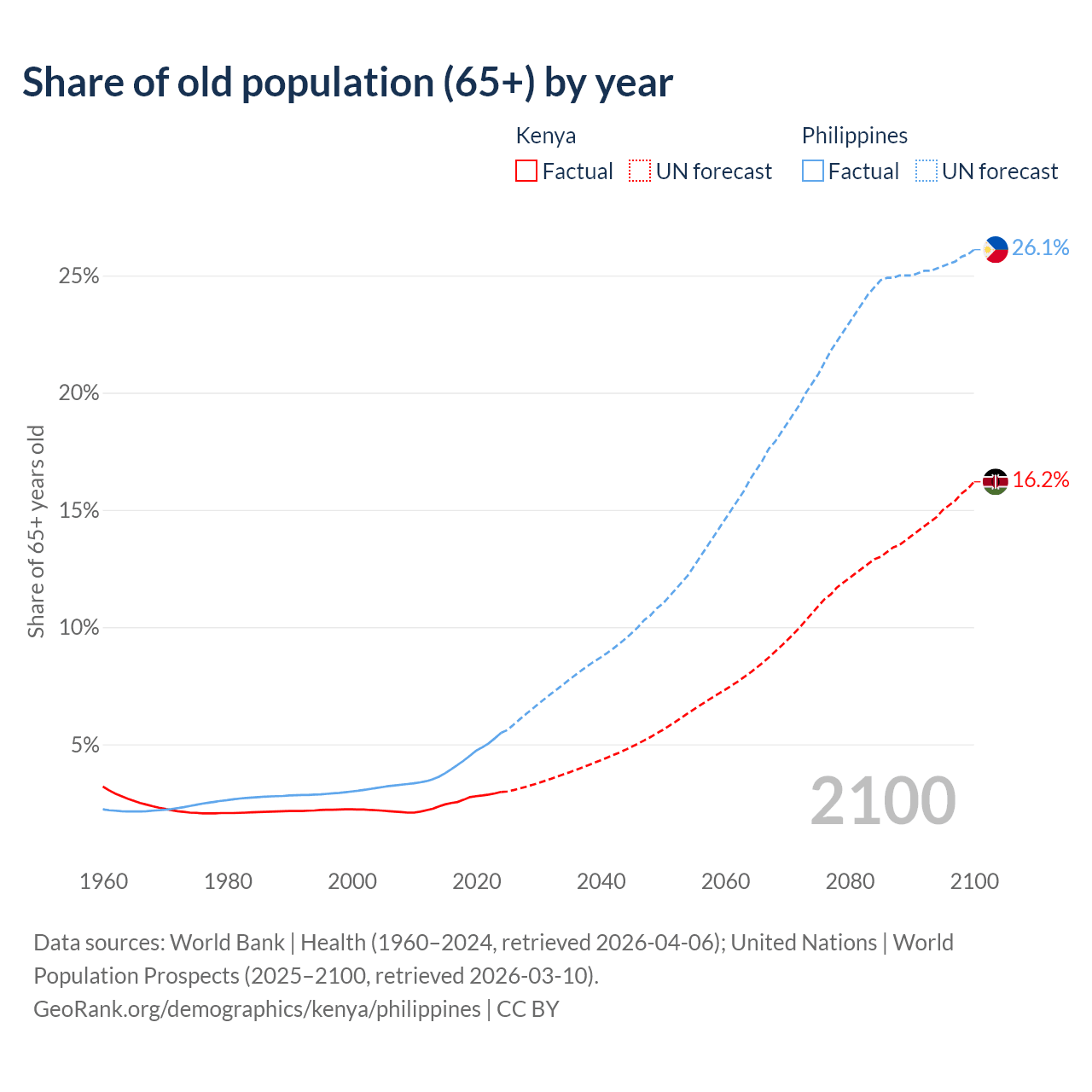 The share of older people aged 65 and over is 2.97% in Kenya and 5.49% in the Philippines. Life expectancy in Kenya compared to the Philippines .