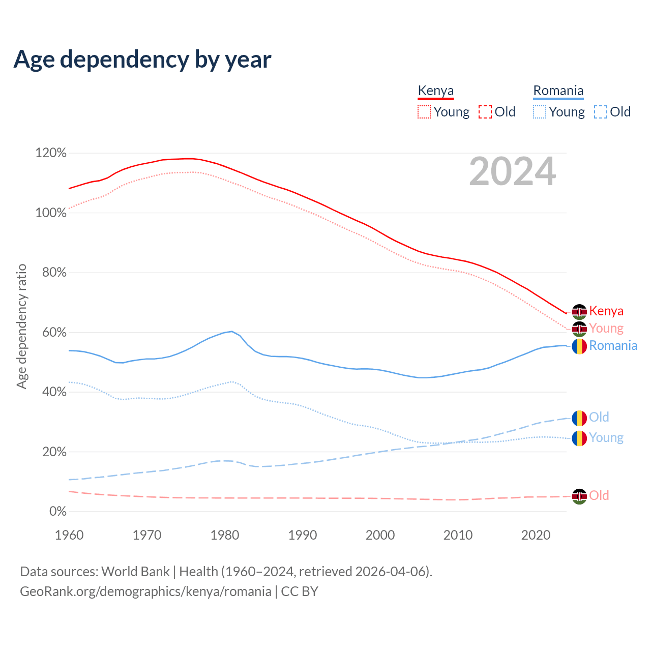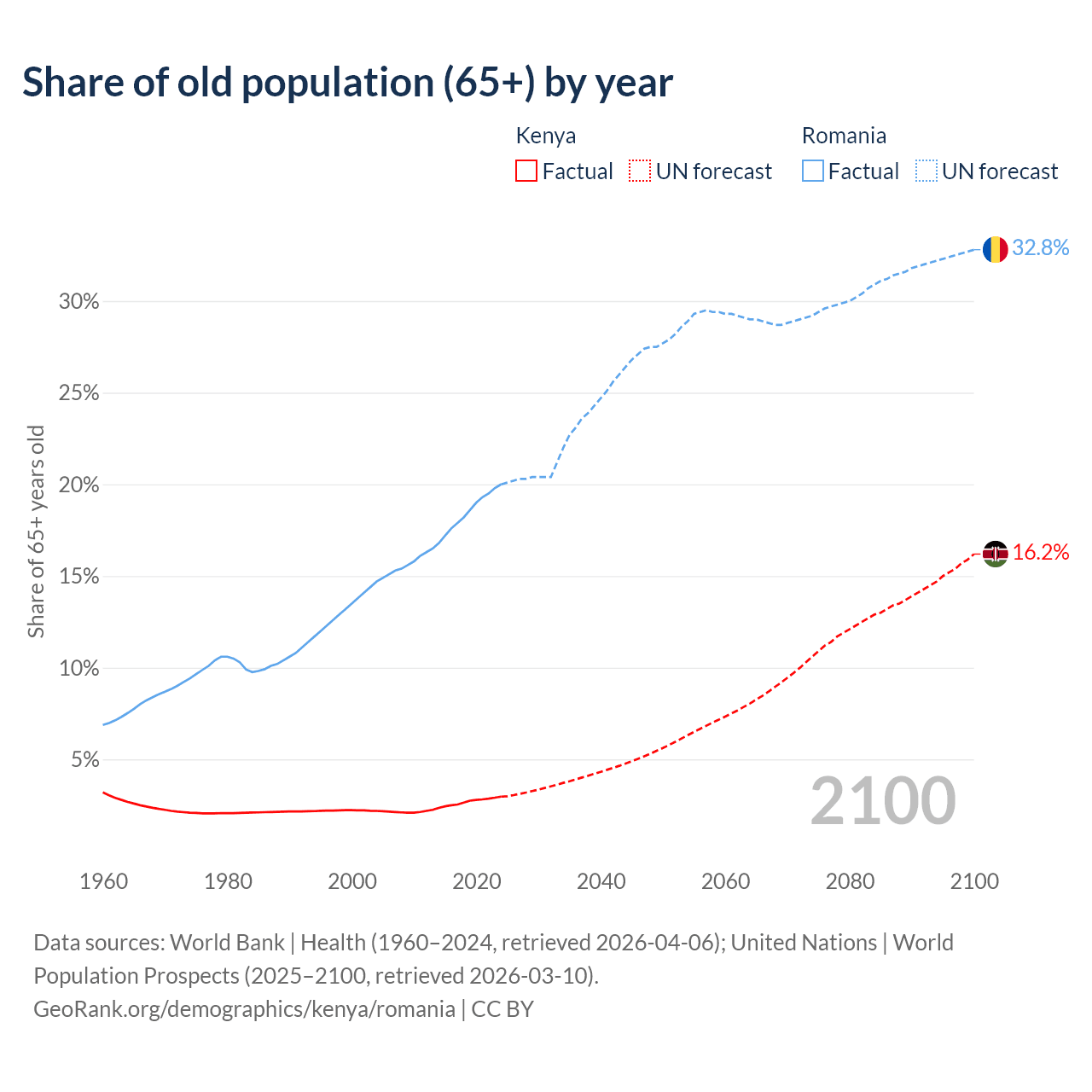 The share of older people aged 65 and over is 2.97% in Kenya and 20% in Romania. Life expectancy in Kenya compared to Romania .