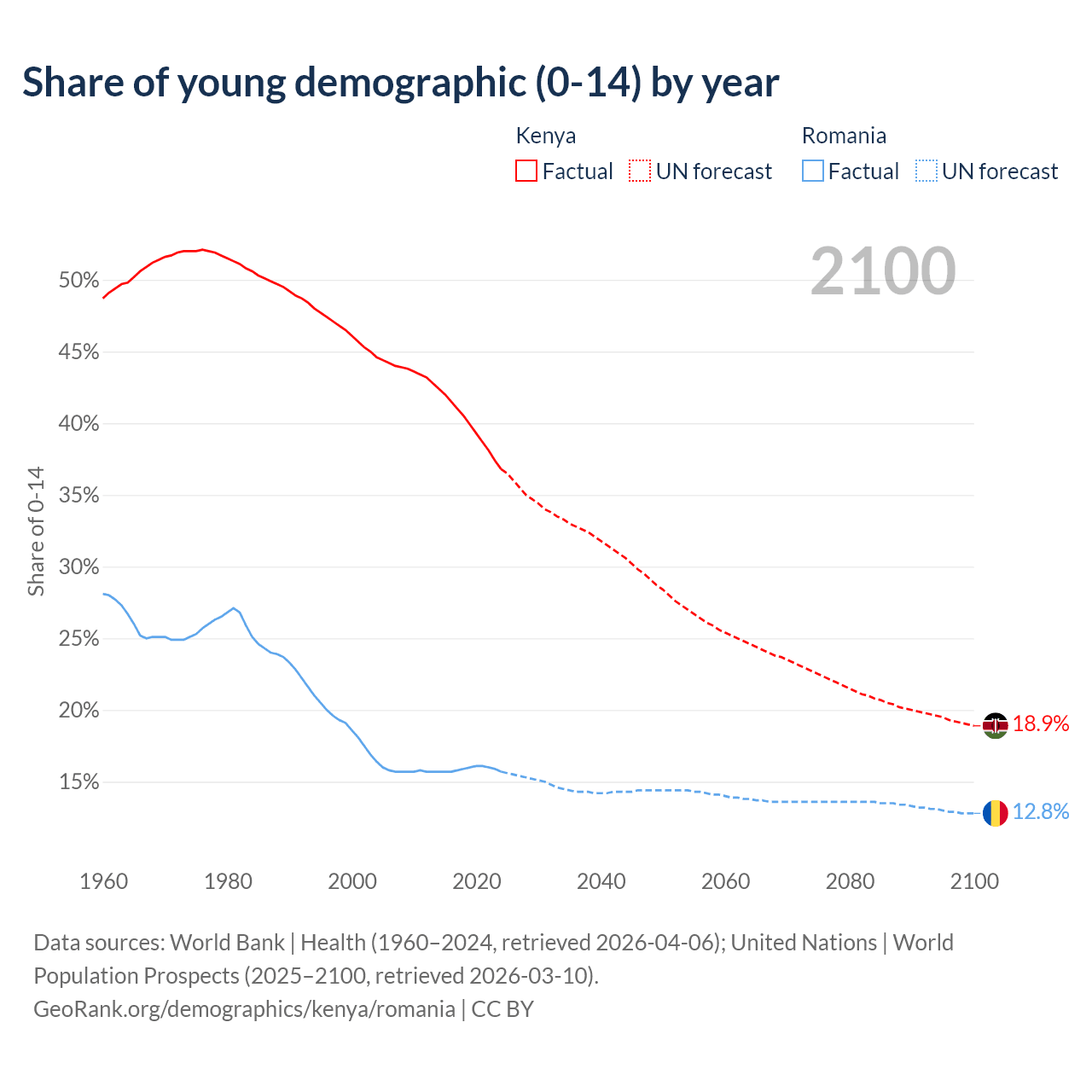 - The share of young demographic (0-15 years old) in Kenya is 36.8% vs 15.7% in Romania.