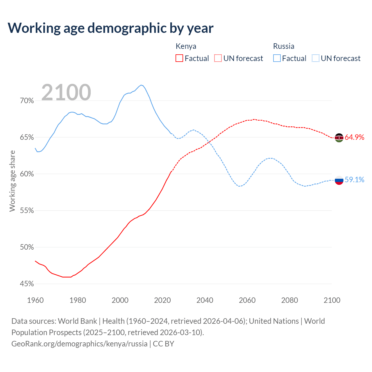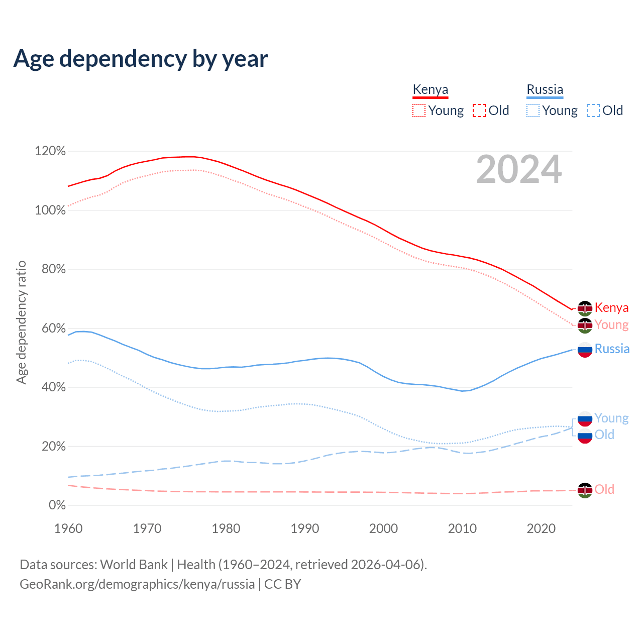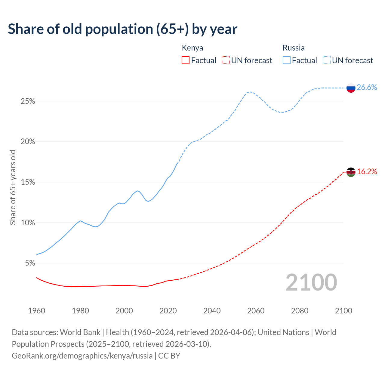 The share of older people aged 65 and over is 2.97% in Kenya and 17.2% in Russia. Life expectancy in Kenya compared to Russia .