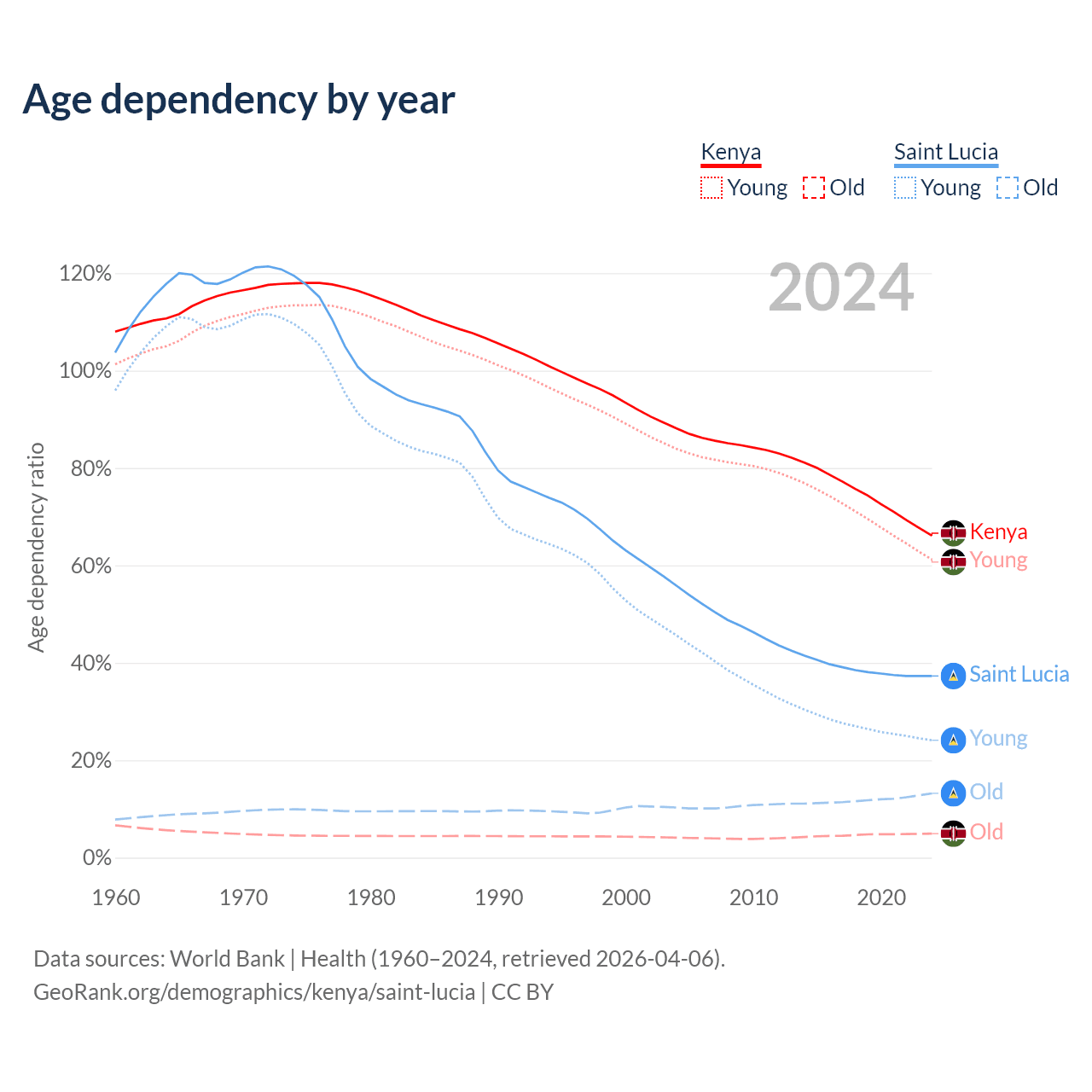 - The share of old-age demographic (65+) in Kenya is 2.97% vs 9.62% in Saint Lucia.