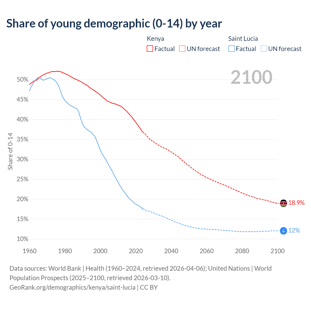 - The share of young demographic (0-15 years old) in Kenya is 36.8% vs 17.5% in Saint Lucia.