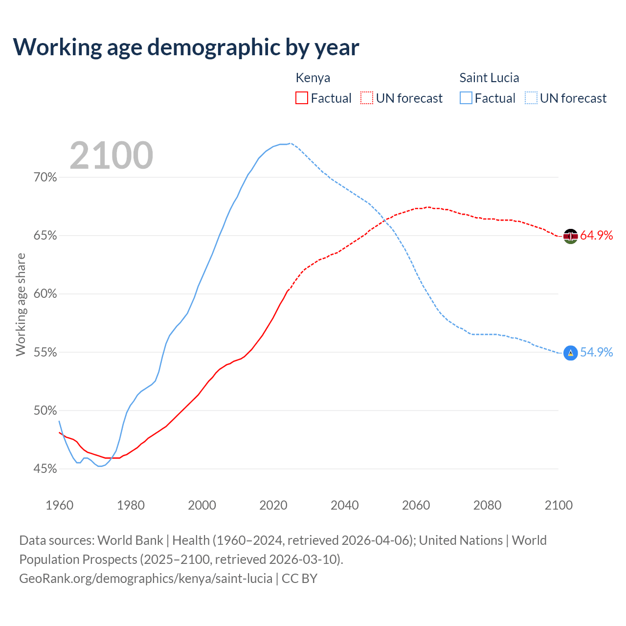 The share of older people aged 65 and over is 2.97% in Kenya and 9.62% in Saint Lucia. Life expectancy in Kenya compared to Saint Lucia .