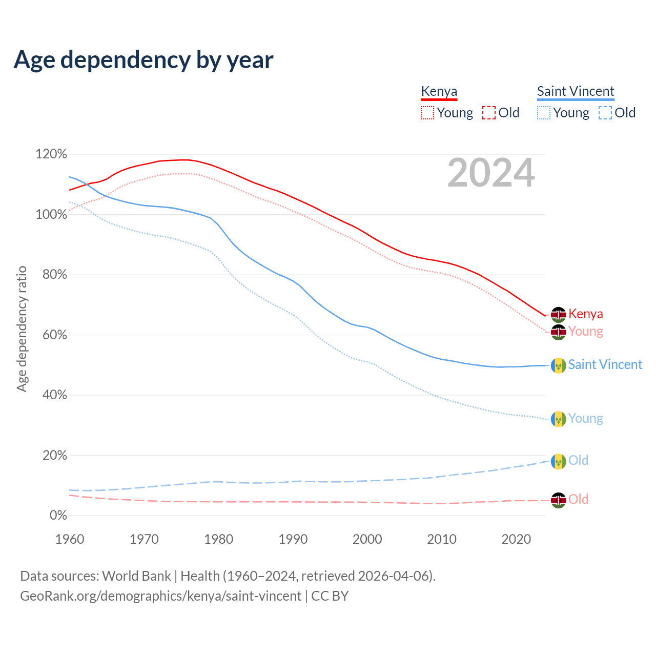 - The share of old-age demographic (65+) in Kenya is 2.97% vs 11.9% in Saint Vincent.