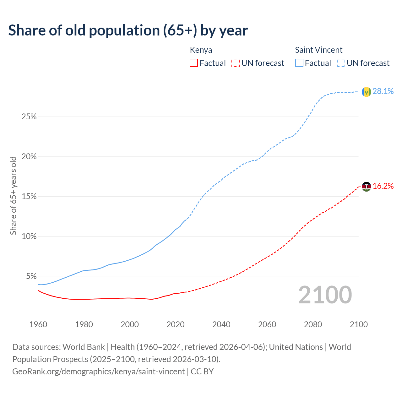 The share of older people aged 65 and over is 2.97% in Kenya and 11.9% in Saint Vincent. Life expectancy in Kenya compared to Saint Vincent .