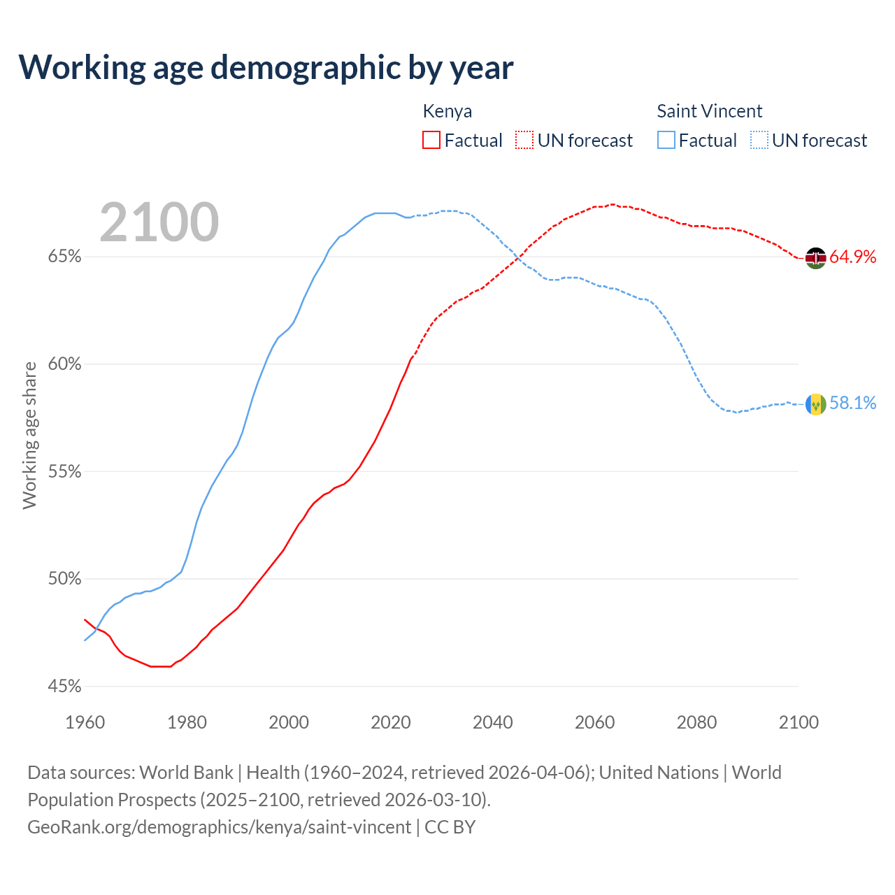 - Kenya has 35.5M working age adults (aged 15-64) vs 66.3K in Saint Vincent.