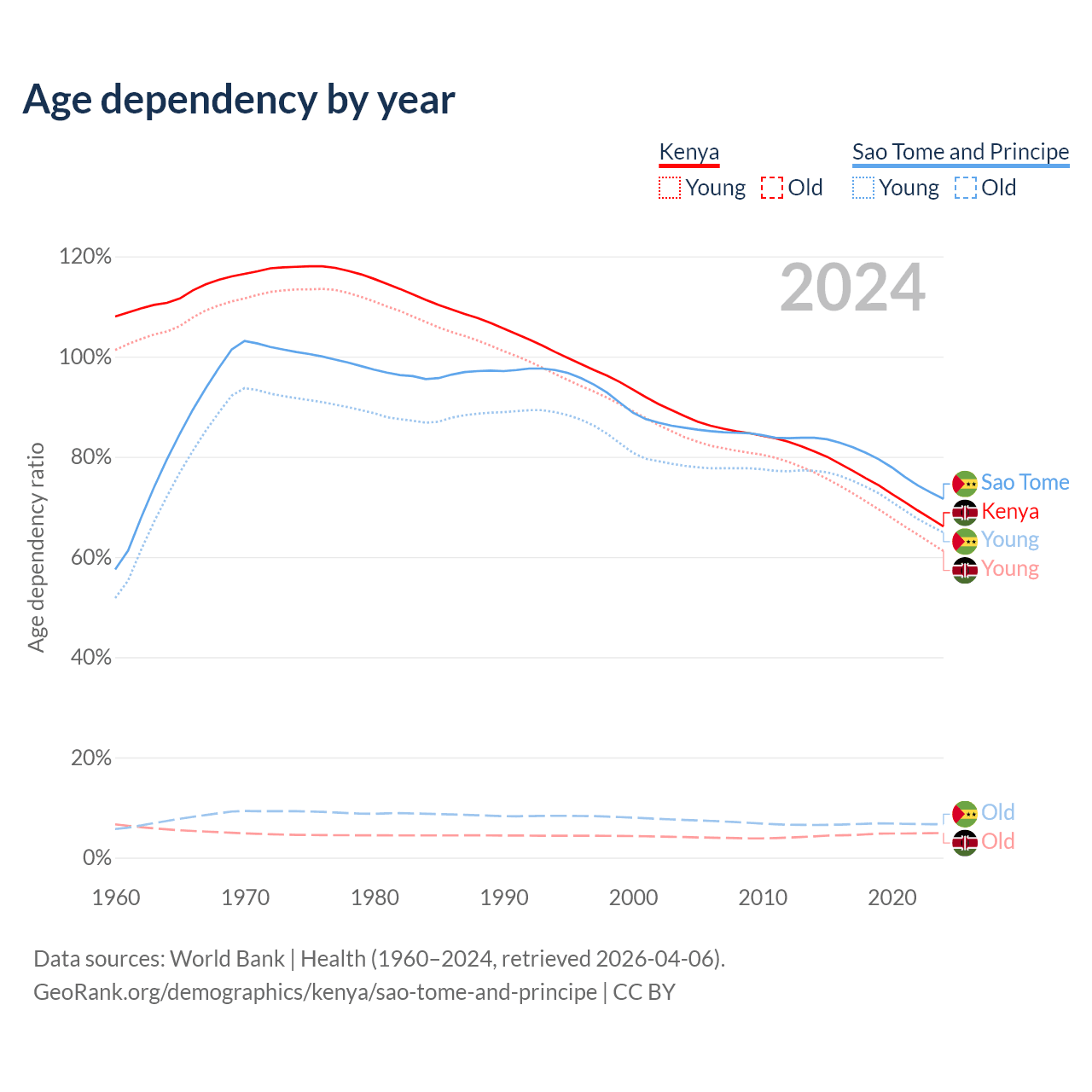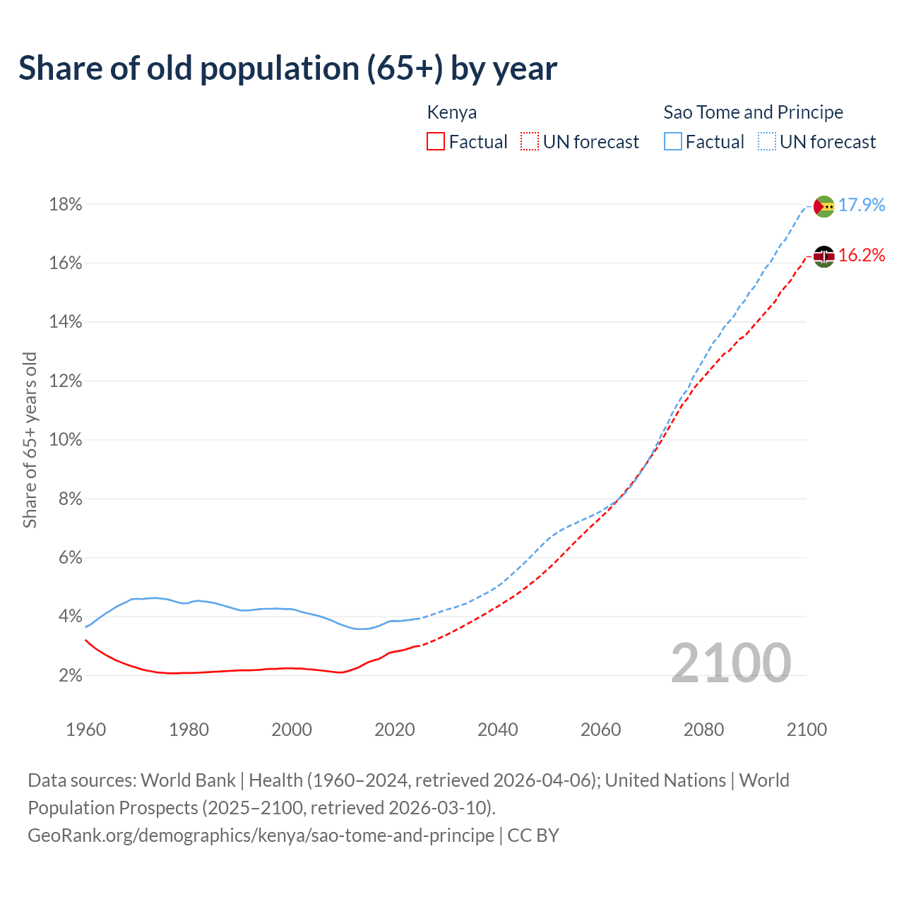 The share of older people aged 65 and over is 2.97% in Kenya and 3.9% in Sao Tome and Principe. Life expectancy in Kenya compared to Sao Tome and Principe .
