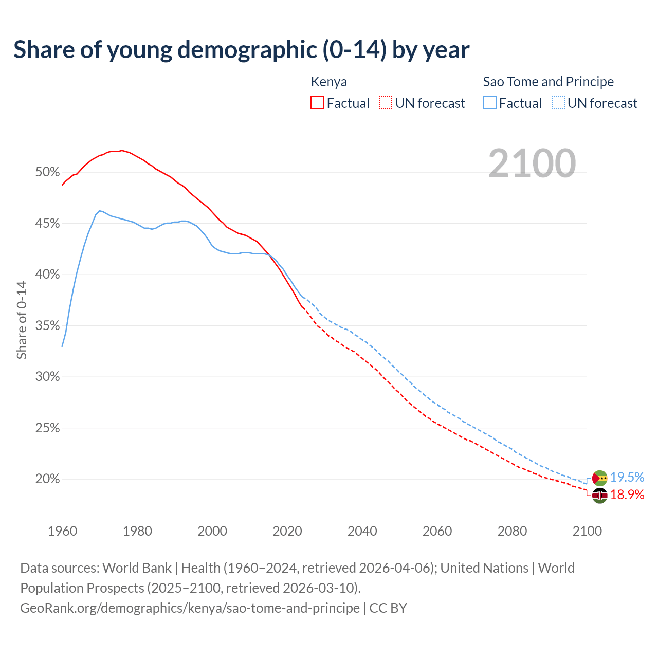 Median age Kenya vs Sao Tome and Principe, 1960-2100