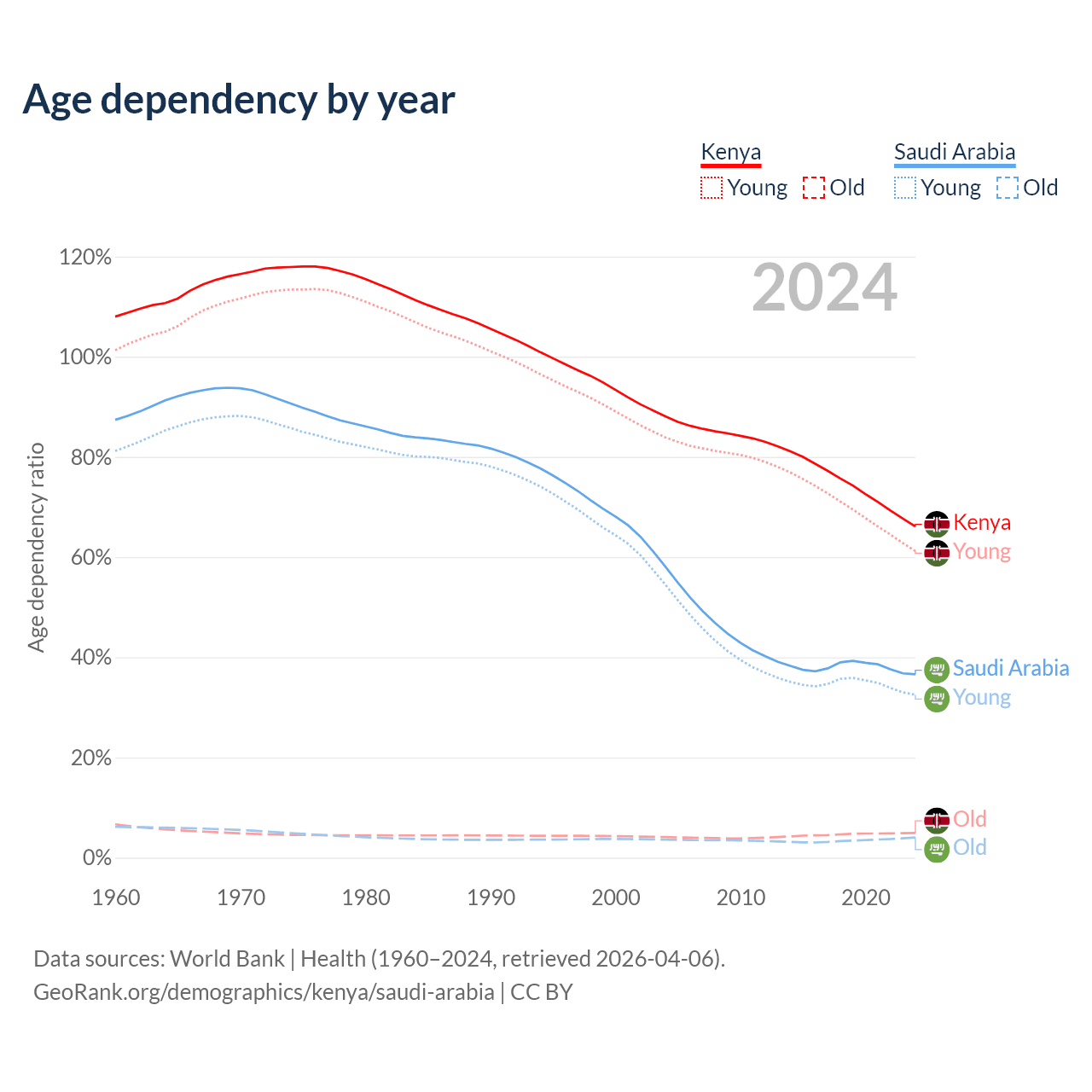 The share of older people aged 65 and over is 2.97% in Kenya and 2.95% in Saudi Arabia. Life expectancy in Kenya compared to Saudi Arabia .