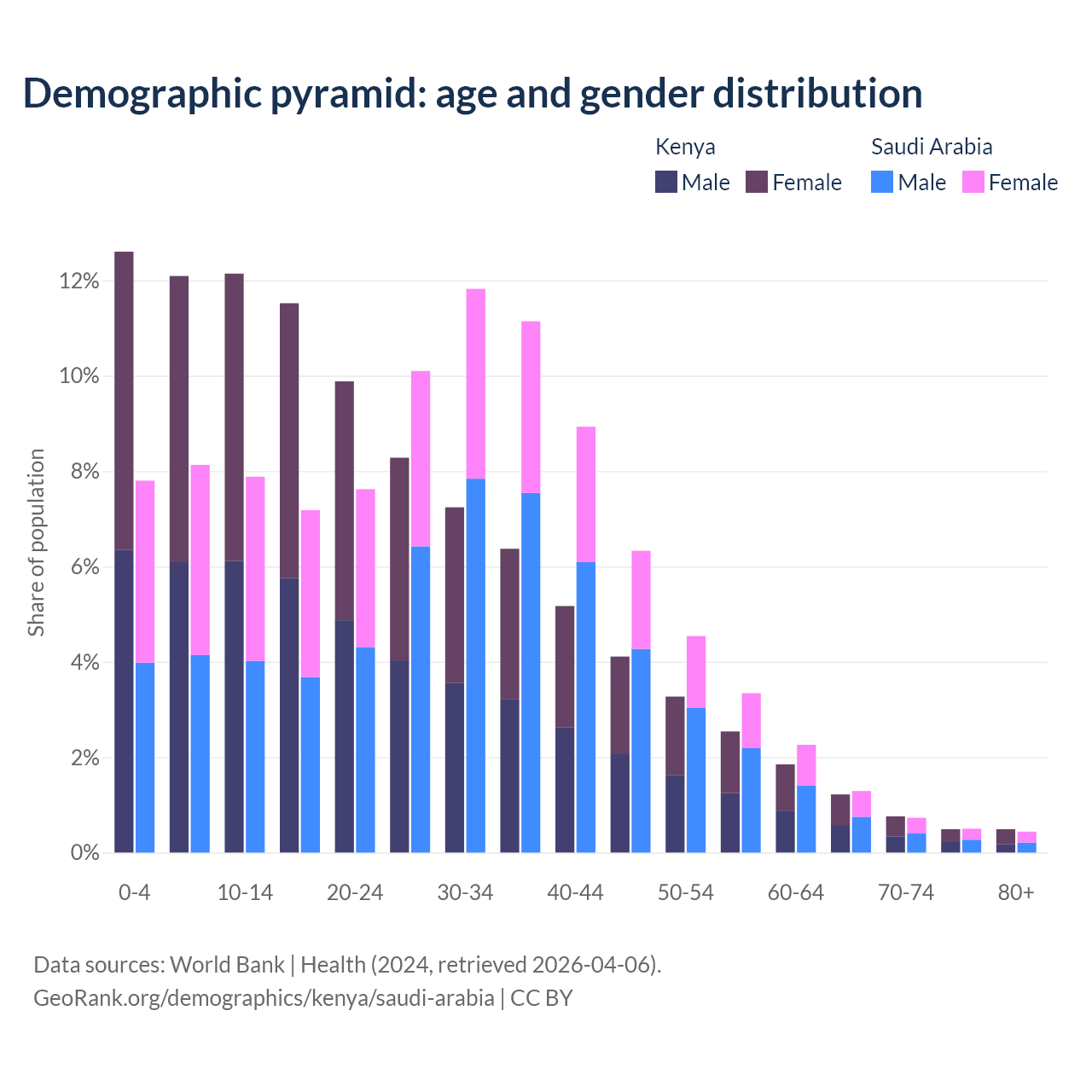 - Kenya is ranked 159/196 by median age (oldest to youngest) vs 98/196 for Saudi Arabia.
