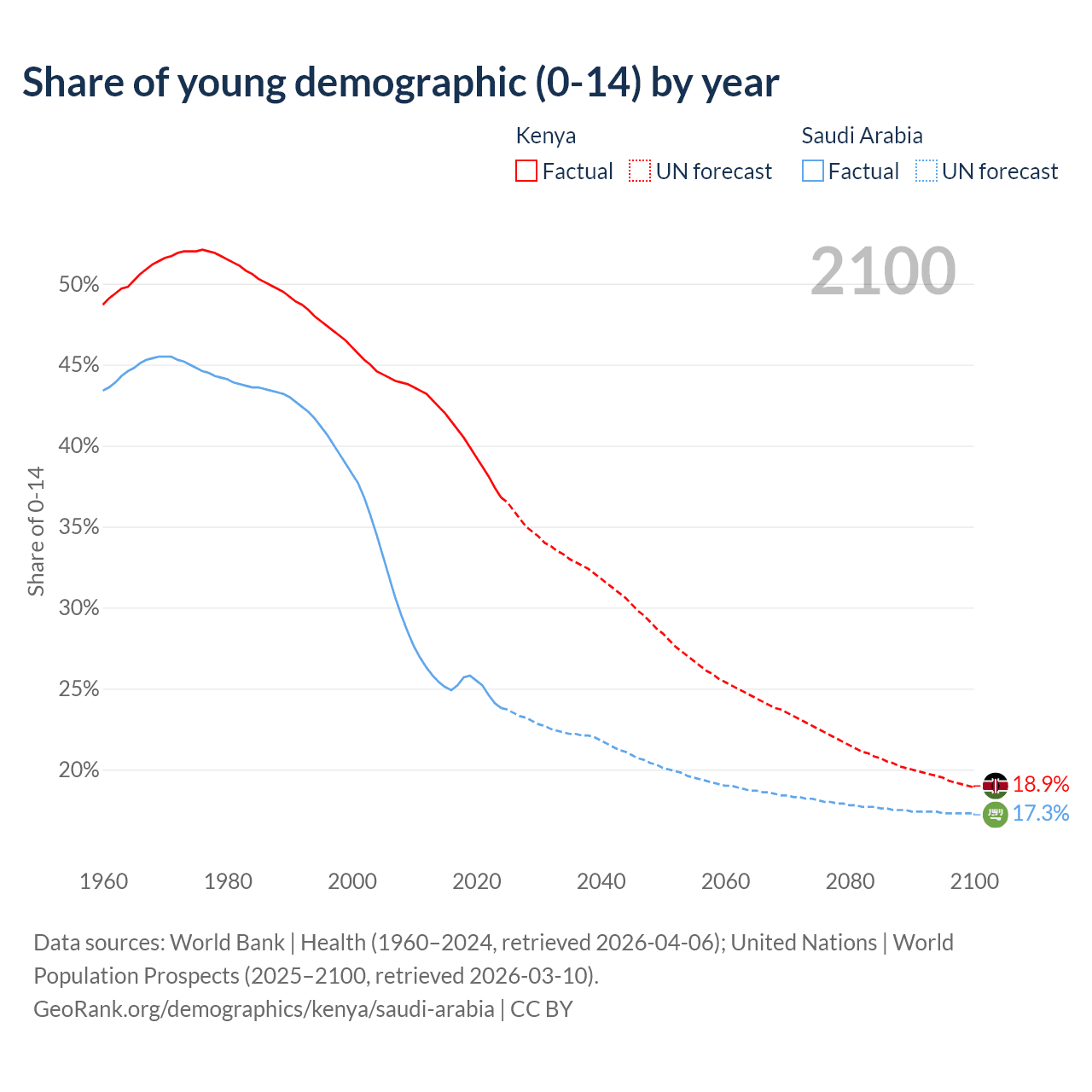- The share of young demographic (0-15 years old) in Kenya is 36.8% vs 23.8% in Saudi Arabia.