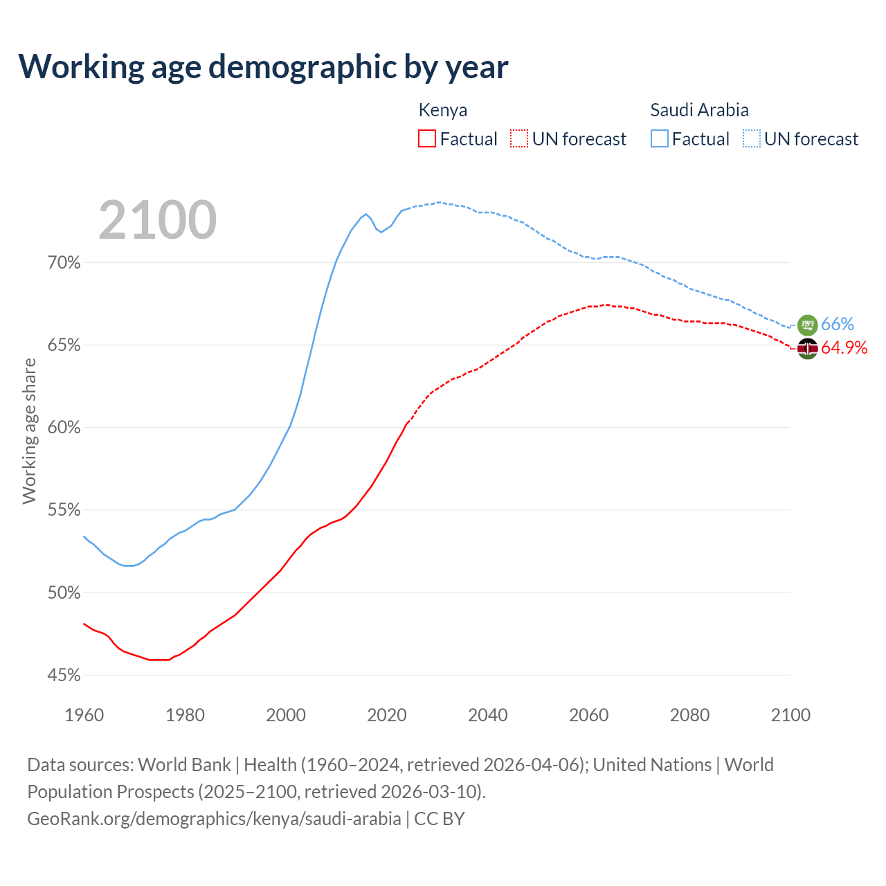- Kenya has 35.5M working age adults (aged 15-64) vs 26.9M in Saudi Arabia.