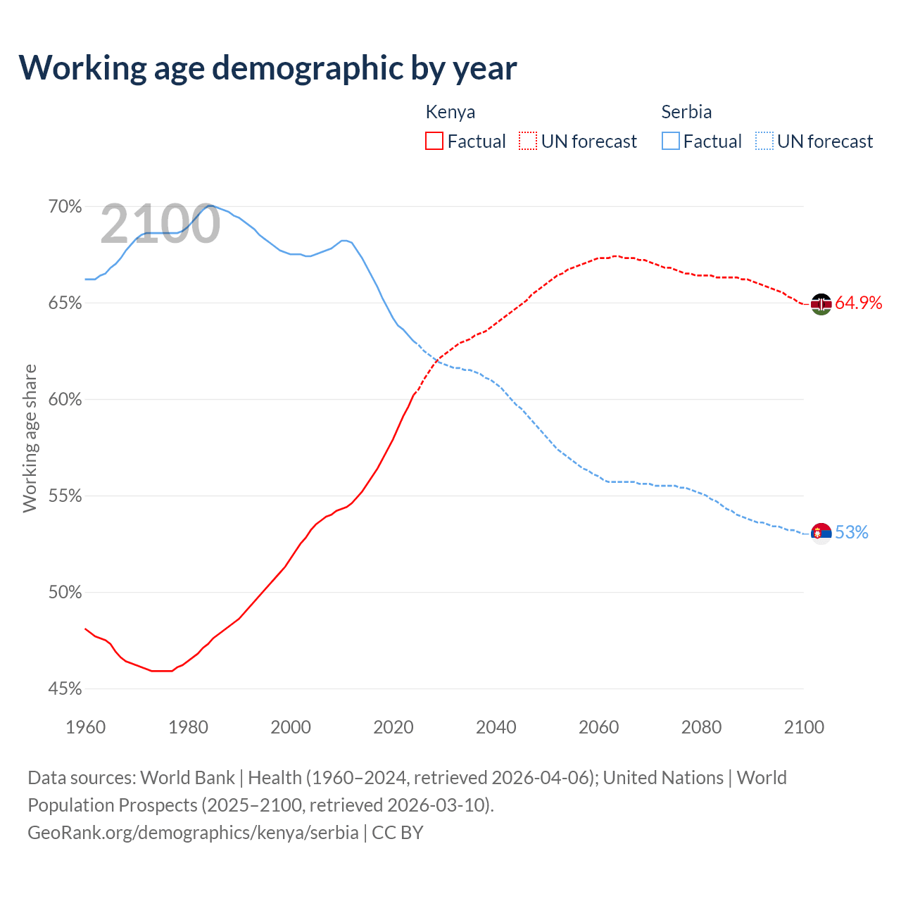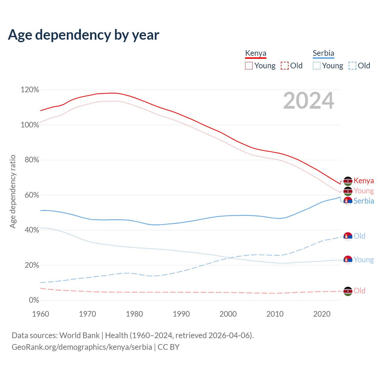 The share of older people aged 65 and over is 2.97% in Kenya and 22.7% in Serbia. Life expectancy in Kenya compared to Serbia .
